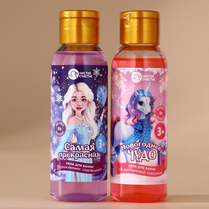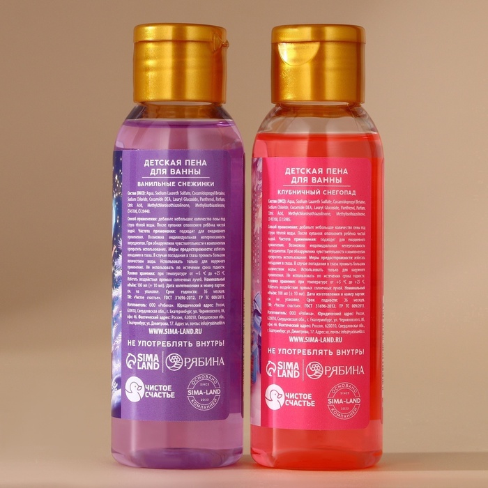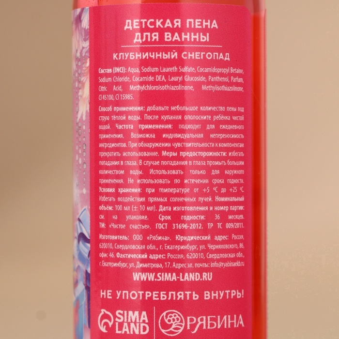 Пена для ванны "Клубничный снегопад": Aqua, Sodium Laureth Sulfate, Cocamidopropyl Betaine, Sodium Chloride, Сocamide DEA, Lauryl Glucoside, Panthenol, Glycerin, Chamomilla Recutita Flower Extract, Parfum, Citric Acid, Methylchloroisothiazolinone, Methylisothiazolinone, Cl 45100, Cl 15985.