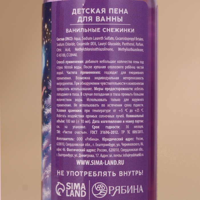 Пена для ванны "Ванильные снежинки": Aqua, Sodium Laureth Sulfate, Cocamidopropyl Betaine, Sodium Chloride, Сocamide DEA, Lauryl Glucoside, Panthenol, Parfum, PEG-40 Hydrogenated Castor Oil, Citric Acid, Methylchloroisothiazolinone, Methylisothiazolinone, Cl 45100, Cl 28440.