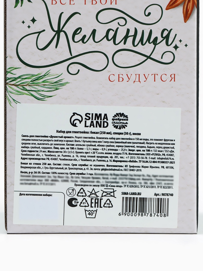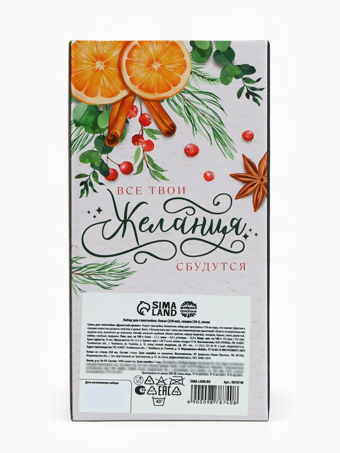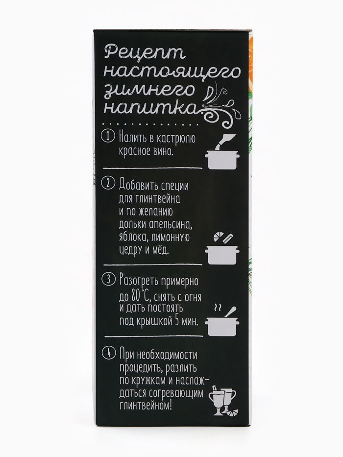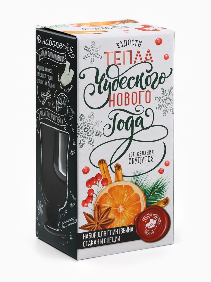 Габариты: 10,5 x 8 x 20,7 Страна: Россия В боксе: 52 набор Состав: См. на упаковке Материалы: см. на упаковке Фасовка: по 1 набор Индивидуальная упаковка: Термоусадочная пленка Сертификат: СТР Набор: Да Цвет: Прозрачный Для кого: Для мужчины, Для женщины, Унисекс В наборе, шт.: 3 Объём, мл: 250 Вид упаковки: Подарочная коробка Рисунок: Нет Символ года: Нет Тематика праздника: Новый год Адресат: Без адресата Назначение: Универсальные Составляющие набора: Специи, Бокал, Носки Темпер. ограничение НЕ ВЫШЕ ℃: +25 Возраст: Для взрослых Текстура: Гладкая Особенности: Без особенностей При оформление заказа, просим запрашивать актуальные сроки годности у менеджераБокал Состав: стекло Срок годности: не ограничен Объем: 250 мл. Смесь для приготовления глинтвейна Состав: корица, имбирь, гвоздика перец душистый, бадьян. Способ приготовления: добавить специи в вино (0,7 л) и нагреть, не допуская кипения. Дать настояться под крышкой 10-15 минут. Срок годности: 24 месяца Масса нетто: 30 г. Носки, р-р: 36-39 Состав: 100 % полиэстер. Срок службы: 10 лет Комментарии к товару