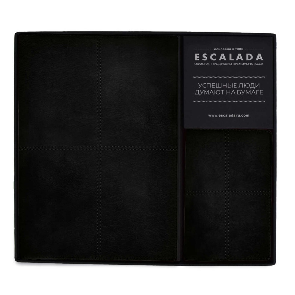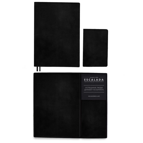 Ежедневник недатированный + обложка для паспорта (набор подарочный) ESCALADA, А5+, 120 л., арт. 70557/ 10 ШЕВРЕТ ЧЁРНЫЙ (кожзам: ежедневника: 175x245 мм, обложки для паспорта: 95х145 мм, мягкий переплёт, запаянный край, материал обложки: искусственная кожа "Шеврет"; способ крепления блока: ниткошвейный; декор: блинтовое тиснение, отделочная строчка; вн. блок: 120 л., кремовый офсет 70 г/м2, печать в одну краску (клетка), справочный материал: есть; перфорация углов блока: нет; отделка среза: окрашивание пантоном; закладка/-и: два ляссе, каптал: есть; форзац: печать пантоном, персонализация возможна: да; индивидуальная упаковка: подарочная картонная коробка с ПВХ-крышкой + ПЭТ-пакет)