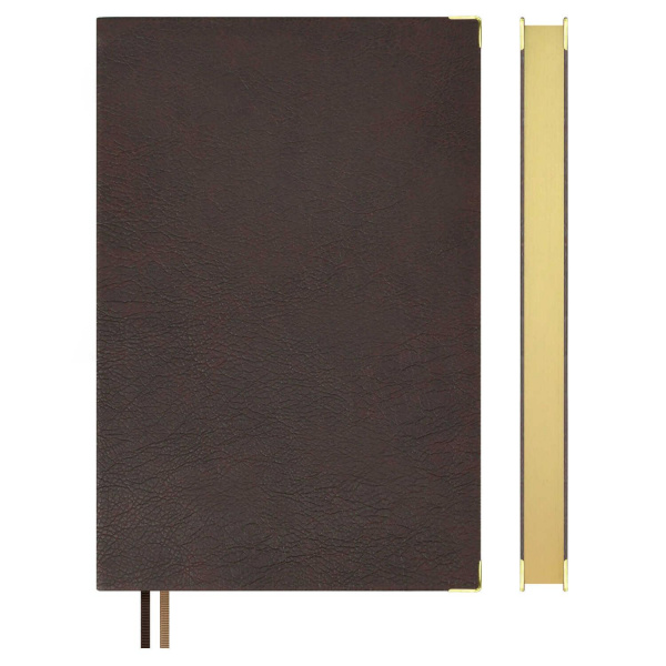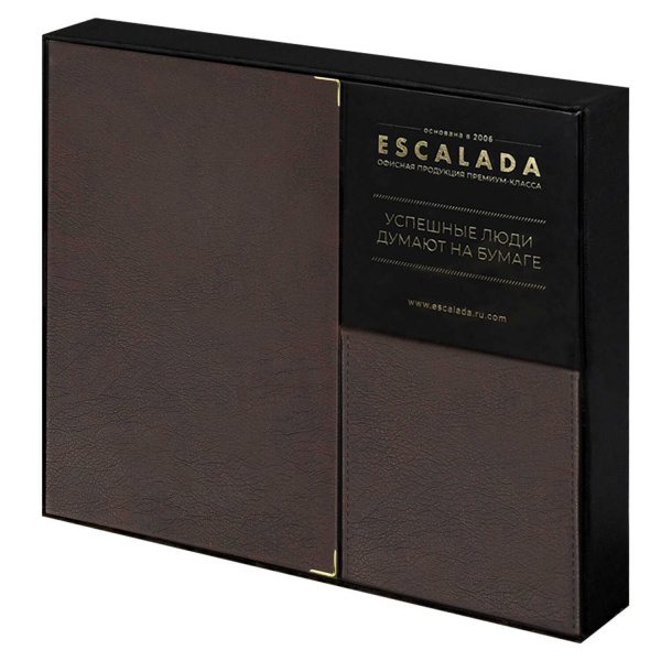 Ежедневник недатированный + подставка с блоком (набор подарочный) ESCALADA, А5, 160 л., арт. 70560/ 5 ШЕВРЕТ ГЛОСС КОРИЧНЕВЫЙ (кожзам: ежедневника: 146х211 мм, подставки для блока: 107х107х28 мм, интегральный переплёт, материал обложки: искусственная кожа "Шеврет глосс"; способ крепления блока: ниткошвейный; декор: металлические уголки, тиснение фольгой; вн. блок: 160 л., белый офсет 70 г/м2, печать в две краски (линия), справочный материал: есть; перфорация углов блока: нет; отделка среза: фольгирование; закладка/-и: два ляссе, каптал: есть; форзац: печать пантоном, персонализация возможна: да; индивидуальная упаковка: подарочная картонная коробка с ПВХ-крышкой + ПЭТ-пакет)