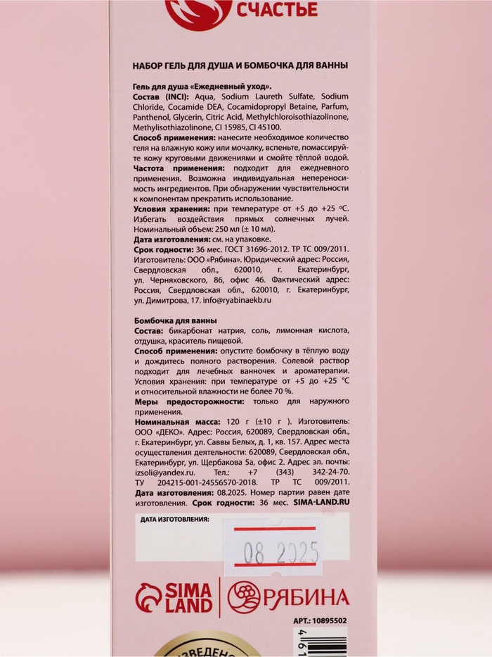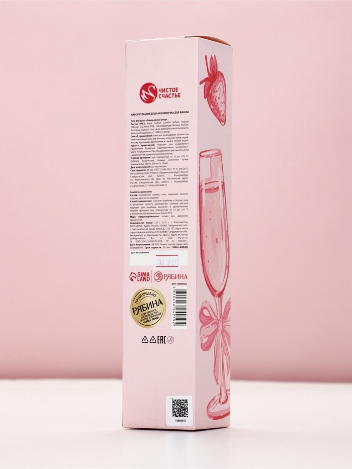 Производитель: Чистое счастье Габариты: 5,5 x 5,5 x 26,5 Страна: Россия В боксе: 50 набор Состав: См. на упаковке Материалы: см. на упаковке Фасовка: по 1 набор Индивидуальная упаковка: Термоусадочная пленка Сертификат: ЕАС Набор: Да Для кого: Для женщины В наборе, шт.: 2 Вид упаковки: Подарочная коробка Тематика праздника: Универсальная тематика, 8 Марта Адресат: Без адресата Возраст: Взрослый Аромат: Ягоды Составляющие набора: Бомбочка для ванн, Гель для душа Возраст: Для взрослых