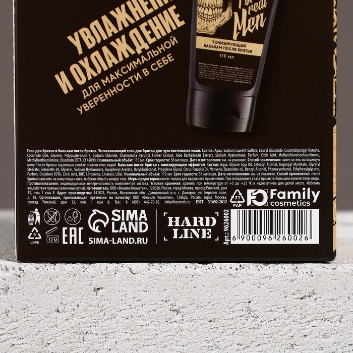 Габариты: 16 x 9,6 x 5 Страна: Россия В боксе: 112 набор Фасовка: по 1 набор Индивидуальная упаковка: Плёнка Сертификат: ЕАС Набор: Да Цвет: Прозрачный Для кого: Для мужчины В наборе, шт.: 2 В упаковке, шт.: 2 Объём, мл: 110 Вид упаковки: Коробка картонная Символ года: Нет Тематика праздника: Универсальная тематика Адресат: Без адресата Возраст: Взрослый Материал: Пластик Область применения: Для лица Аромат: Свежесть Применение: Для бритья, После бритья Составляющие набора: Гель после бритья, Гель для бритья Темпер. ограничение НЕ НИЖЕ ℃: +5 Темпер. ограничение НЕ ВЫШЕ ℃: +25 Возраст: Для взрослых Тип кожи: Чувствительная Назначение: Увлажнение Форма выпуска: Туба Комментарии к товару