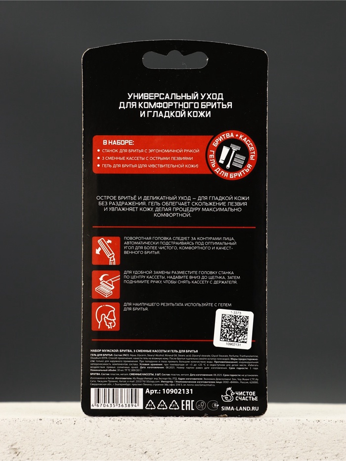 Производитель: Чистое счастье Габариты: 10 x 20 x 2,5 Страна: Китай В боксе: 240 набор Фасовка: по 1 набор Индивидуальная упаковка: Блистер Габариты товара: 15 см × 10 см × 2 см Сертификат: ЕАС Для кого: Для мужчины В наборе, шт.: 5 Вид упаковки: Блистер Тематика праздника: Универсальная тематика Адресат: Без адресата Возраст: Взрослый Составляющие набора: Бритвенный станок, Гель для бритья Возраст: Для взрослых