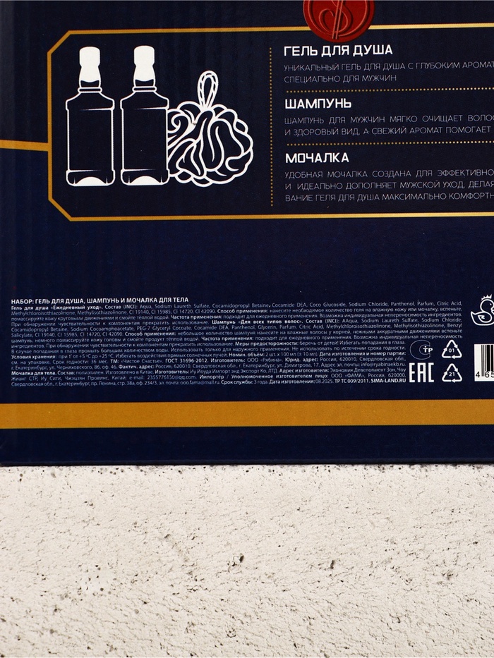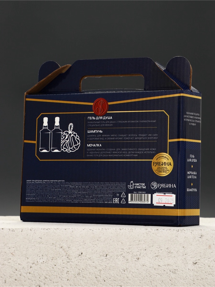 Габариты: 5 x 18 x 16,5 Страна: Россия В боксе: 42 набор Состав: См. на упаковке Материалы: см. на упаковке Фасовка: по 1 набор Индивидуальная упаковка: Термоусадочная пленка Сертификат: ЕАС Для кого: Для мужчины В наборе, шт.: 3 Вид упаковки: Подарочная коробка Тематика праздника: 23 Февраля, Универсальная тематика Адресат: Без адресата Возраст: Взрослый Аромат: Древесный Составляющие набора: Гель для душа, Шампунь, Мочалка Возраст: Для взрослых Комментарии к товару