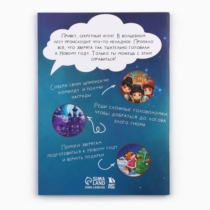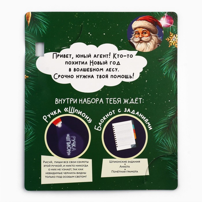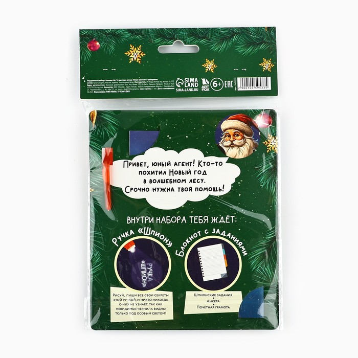 Габариты: 1,5 x 15 x 17 Страна: Китай В боксе: 400 набор Состав: Бумага, картон, пластик, чернила Материалы: бумага, картон, пластик, чернила Фасовка: по 1 набор Индивидуальная упаковка: Клапан, пакет Габариты товара: 21 см × 15 см × 1 см Сертификат: ЕАС Набор: Да Для кого: Для мальчика Формат: А6 Тип скрепления: На скобе В наборе, шт.: 2 Количество листов: 16 Отделка: Без отделки Материал обложки: Бумага Вид упаковки: Пакет Символ года: Нет Тематика праздника: Новый год Адресат: Без адресата Возраст: Детский Материал: Пластик, Бумага, Картон Составляющие набора: Ручка, Блокнот Вид обложки: Мягкая Дизайн обложки: С рисунком В новогоднем наборе вы найдёте увлекательную историю о том, как кто-то похитил праздник в волшебном лесу. Вам предстоит стать секретным агентом и вернуть Новый год. В наборе есть блокнот формата А6 на 16 листов для записи секретных дел, а также ручка, которая пишет особыми чернилами, видимыми только под ультрафиолетовым светом. С этим набором вы сможете хранить свои тайны, которые никто не сможет прочитать. В блокноте также есть шпионские задания: анкета и почётная грамота. Набор оформлен в праздничном стиле и станет отличным подарком для ребёнка. Комментарии к товару