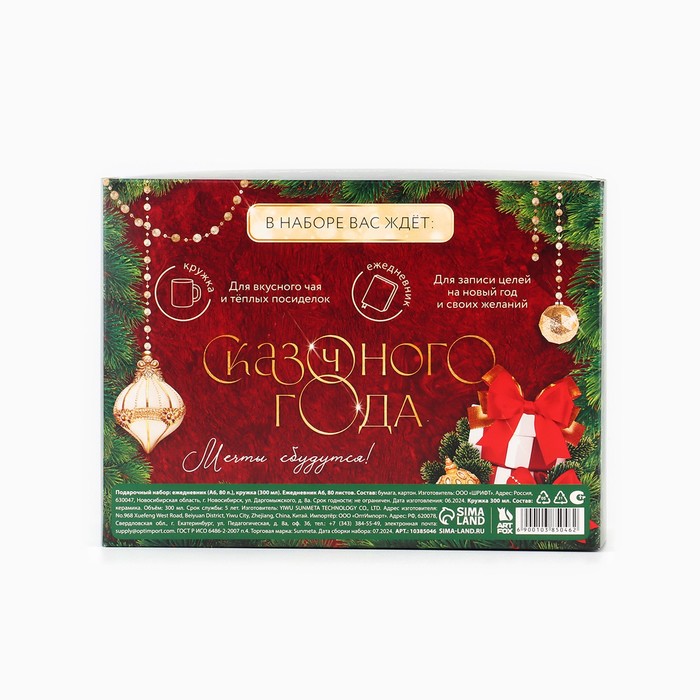 Габариты: 8,2 x 18,7 x 14 Страна: Китай В боксе: 20 набор Состав: См. на упаковке Материалы: см. на упаковке Фасовка: по 1 набор Индивидуальная упаковка: Стрейч-пленка Сертификат: РСТ Набор: Да Для кого: Для женщины В наборе, шт.: 2 Вид упаковки: Плёнка Символ года: Нет Тематика праздника: Новый год Адресат: Без адресата Возраст: Взрослый Составляющие набора: Кружка, Ежедневник Подарочный набор включает ежедневник формата А6 на 80 листов и кружку объёмом 300 мл. Эти предметы станут отличным презентом для друзей и родных. Ежедневник оформлен в новогоднем дизайне и поможет в планировании дел, а кружка будет напоминать о празднике и согревать горячими напитками. Комментарии к товару
