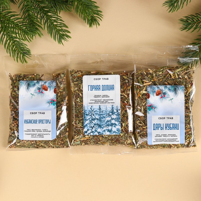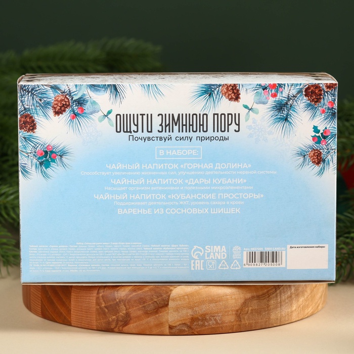 Габариты: 6,5 x 19,7 x 12,3 Страна: Россия В боксе: 46 набор Состав: См. на упаковке Материалы: см. на упаковке Фасовка: по 1 набор Индивидуальная упаковка: Термоусадочная пленка Сертификат: ЕАС Набор: Да Для кого: Унисекс В наборе, шт.: 2 Вид упаковки: Подарочная коробка Символ года: Нет Тематика праздника: Новый год Адресат: Без адресата Составляющие набора: Варенье, Чай Темпер. ограничение НЕ ВЫШЕ ℃: +25 Возраст: Для взрослых Фиксированная цена: Да ПРИ ОФОРМЛЕНИИ ЗАКАЗА, ПРОСИМ ЗАПРАШИВАТЬ АКТУАЛЬНЫЕ СРОКИ ГОДНОСТИ У МЕНЕДЖЕРА Чайный напиток "Горная долина" Состав: душица (трава), чабрец (трава), таволга (трава), зверобой (трава). Чайный напиток "Дары Кубани" Состав: мята (лист), клевер луговой (трава), ромашка (цвет), шалфей (лист), таволга (трава), малина (лист). Чайный напиток "Кубанские просторы" Состав: земляника садовая (лист), галега лекарственная (трава), орех грецкий (лист), череда (трава), кориандр (семена). Способ приготовления: 1 чайную ложку напитка залить стаканом кипятка, настоять 15 минут, процедить. Можно использовать в качестве добавки к чёрному и зелёному чаю. Срок годности: 24 месяца Масса нетто: 20 г. Варенье Состав: сосновая шишка, сахар, вода. Срок годности: 24 месяца Объем: 100 мл. Комментарии к товару