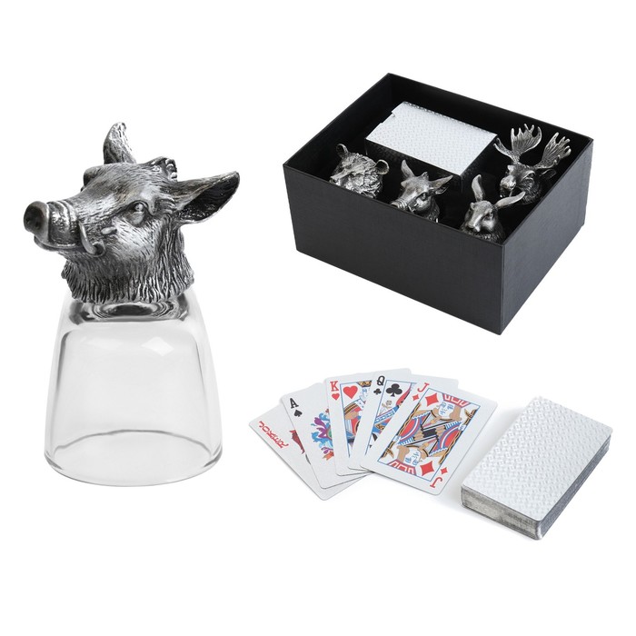 Этот комплект совмещает удобство посуды и развлечение, подчеркивает вкусы и делает время за столом насыщенным и динамичным. Оптимальный подарок ценителям простой, но продуманной мужской посуды и аксессуаров. КомплектацияРюмка - 4 шт. Колода карт - 1 шт. Комментарии к товару