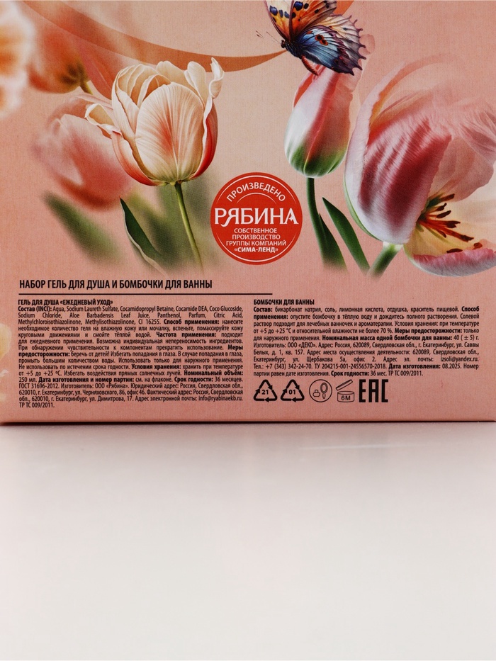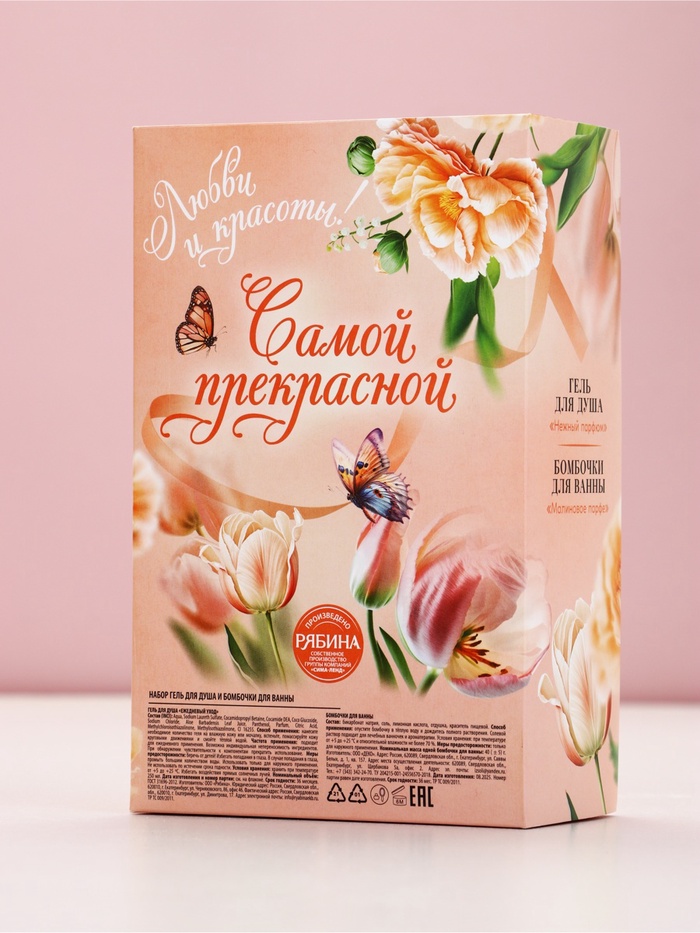 Производитель: Чистое счастье Габариты: 6,5 x 12,5 x 20 Страна: Россия В боксе: 24 набор Состав: См. на упаковке Материалы: см. на упаковке Фасовка: по 1 набор Индивидуальная упаковка: Термоусадочная пленка Сертификат: ЕАС Для кого: Для женщины В наборе, шт.: 2 Вид упаковки: Подарочная коробка Тематика праздника: 8 Марта Адресат: Без адресата Возраст: Взрослый Аромат: Парфюм, Малиновое парфе Составляющие набора: Бомбочка для ванн, Гель для душа Возраст: Для взрослых