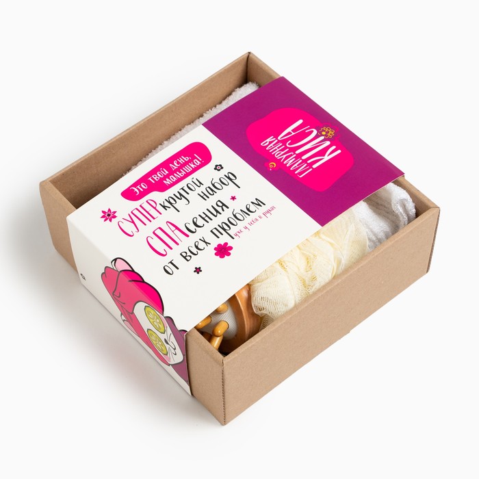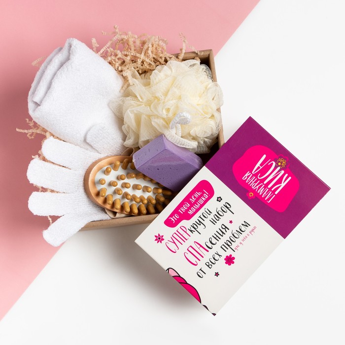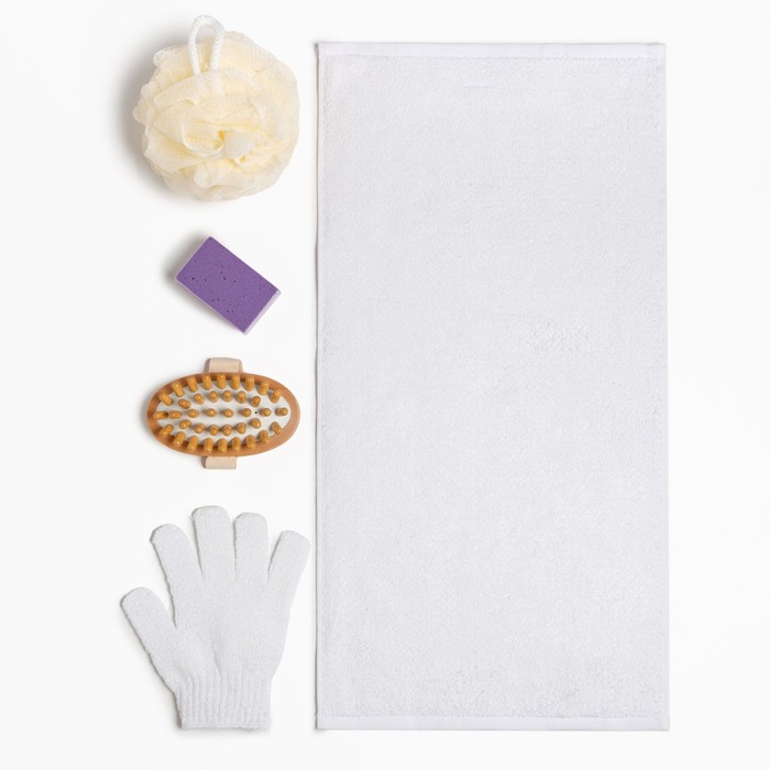 В набор входит полотенце 30 × 60 см, массажёр, мочалка, пемза, мочалка-варежка.