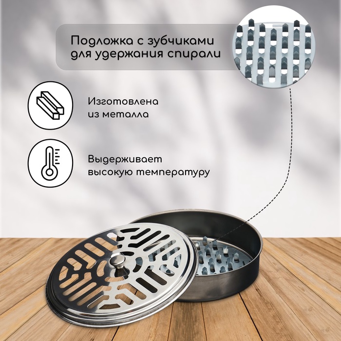 Использование этой подставки способствует улучшению качества отдыха на свежем воздухе, создавая барьер для комаров. Просто поместите спираль внутрь подставки, прикройте крышкой и наслаждайтесь временем без надоедливых насекомых.