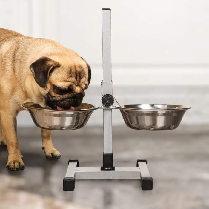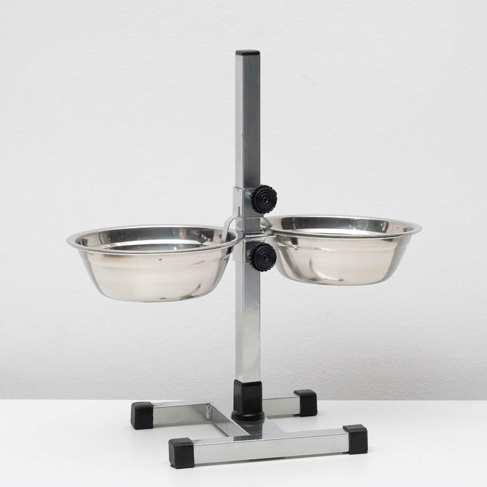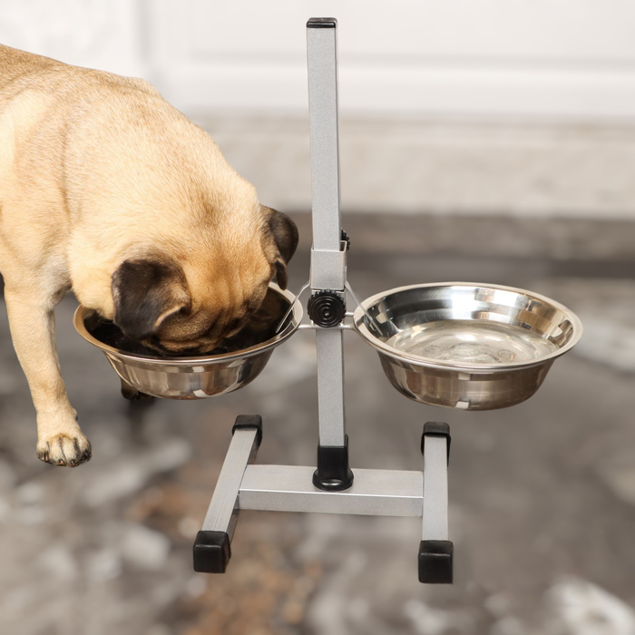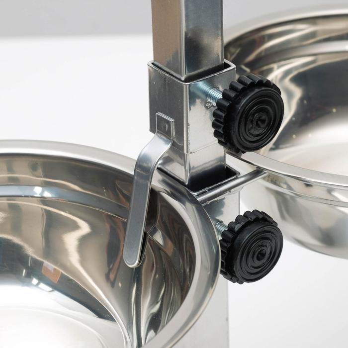 Стойка с 2-мя мисками для кормления сразу нескольких животных, это – идеальное решение для кормления щенков и собак подростков, живущих на одной территории. Качественные, практичные и функциональные миски для собак размещены на регулируемой подставке, которая будет "расти" вместе с вашими малышами. Винтовая кормушка убережёт помещение от загрязнения кормом и водой. Металлическая конструкция очень устойчивая, поэтому ее очень сложно сдвинуть или опрокинуть даже самым активным щенкам. Стойка и миски хорошо переносят обработку горячей водой, моющими и дезинфицирующими средствами.