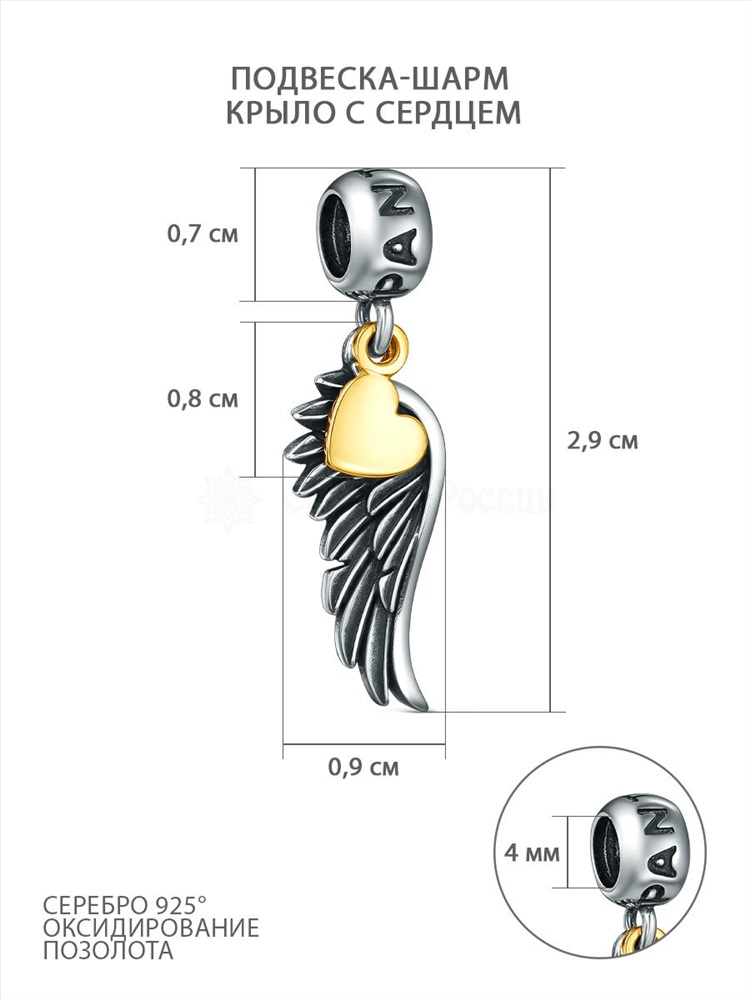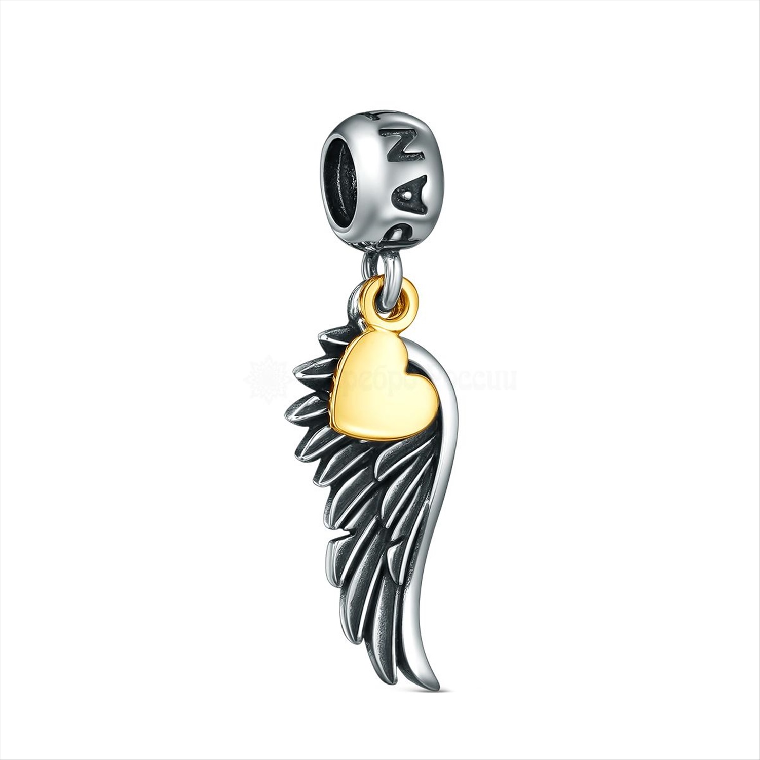 Подвеска-шарм из чернёного серебра с позолотой - Крыло и сердце 620077
