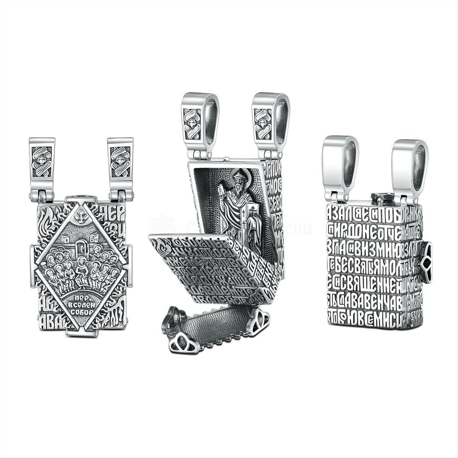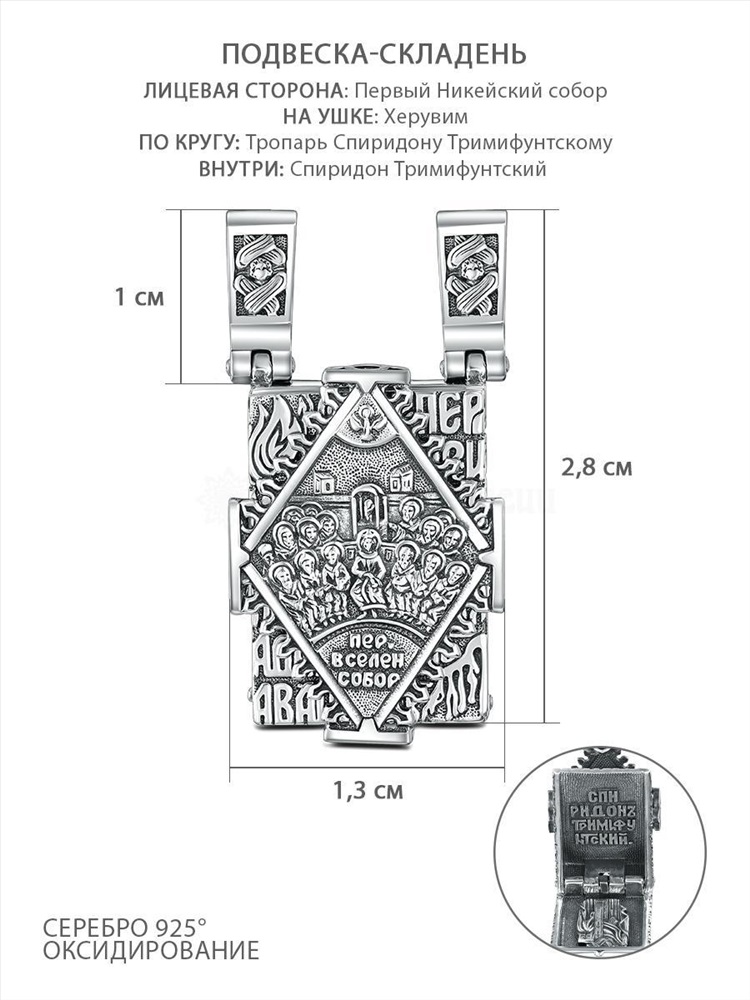Подвеска-складень из чернёного серебра - Первый Никейский собор, Херувим, Тропарь Спиридону Тримифунтскому, Спиридон Тримифунтский П-282