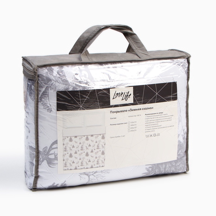 Производитель: LoveLife Габариты: 35 x 27 x 10 Страна: Россия В боксе: 4 шт Состав: Полиэстер 100% Материалы: полиэстер Фасовка: по 1 шт Сертификат: ЕАС Цвет: Серый, Белый Ткань: Микрофайбер Длина, см: 210 Ширина, см: 150 Тематика: Новогодняя Вид упаковки: PVC-сумка Тематика праздника: Новый год Декоративные элементы: Отстрочка Рекомендации по уходу: Глажка при 110 °С, Деликатная стирка при 30 °С, Не отбеливать, Барабанная сушка при низкой температуре Состав ткани: Полиэстер