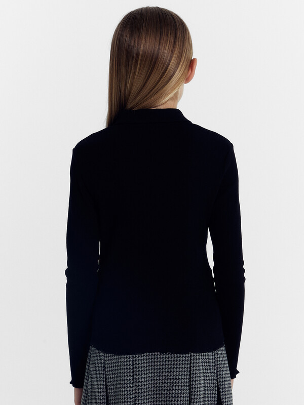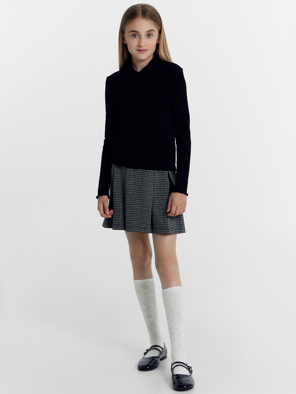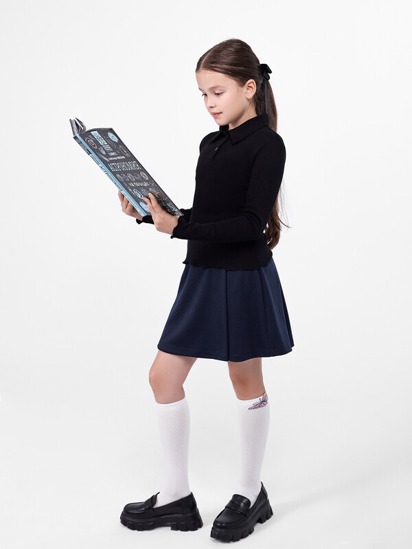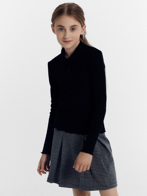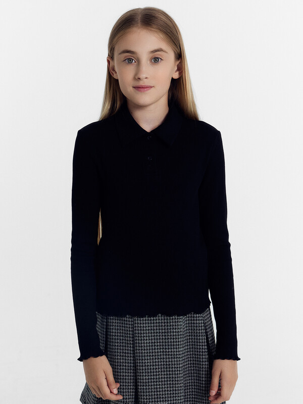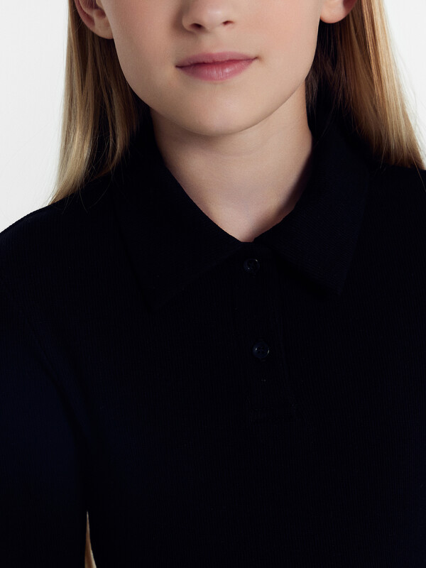 Поло для девочек полуприлегающего силуэта. С короткими рукавами. С воротником-поло. Линия втачивания воротника закрыта бейкой из кулирного полотна. Застежка на пуговицы. Низ изделия и рукавов обработан микрооверлоком.