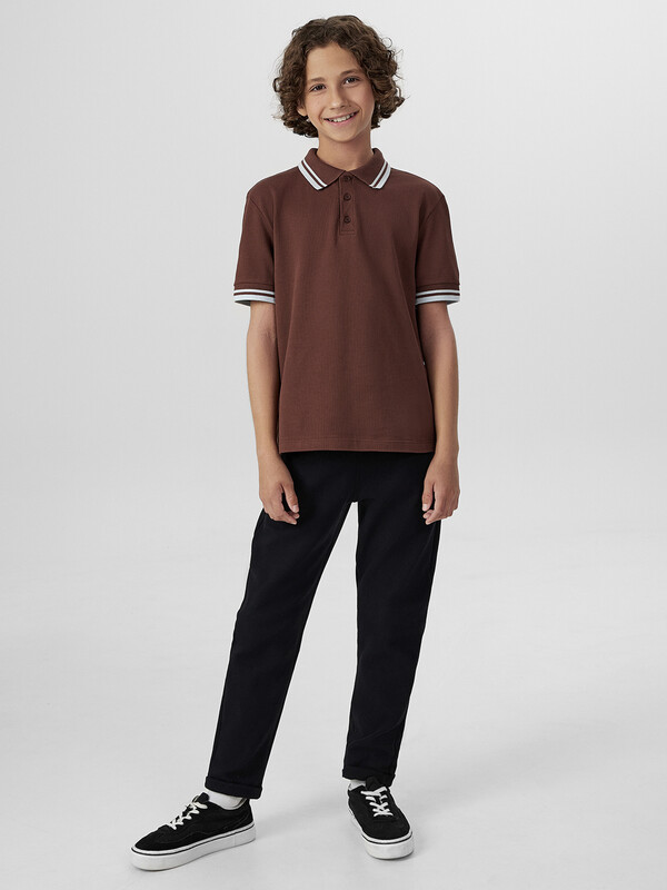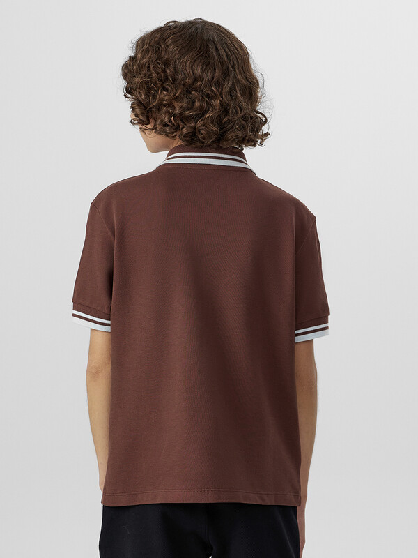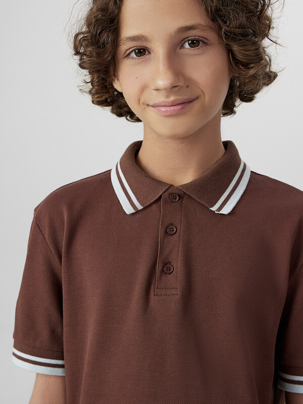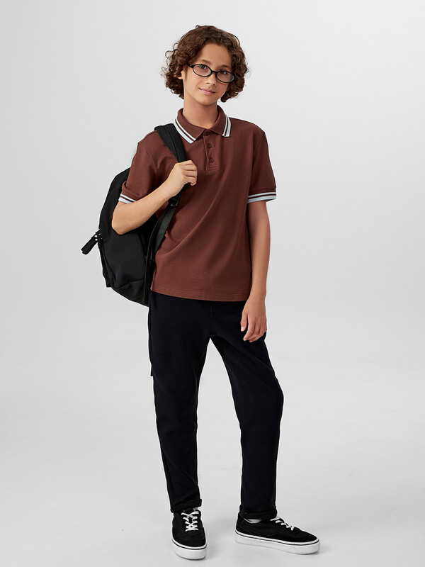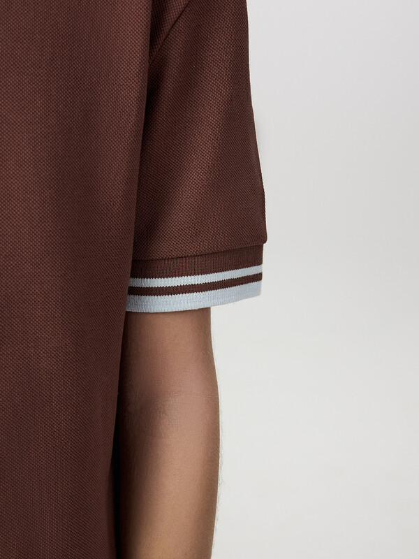 Поло свободного силуэта, перед и спинка цельнокроеные. По переду обработана застежка «поло» на 3 петли и пуговицы (d=10мм). Горловина с воротником стойкой из довяза DVС-100/001-0/5. Рукав втачной, одношовный, плечо спущено. Низу рукава - довяз DM2С-35/001-0/5. Низ изделия обработан швом в подгибку.