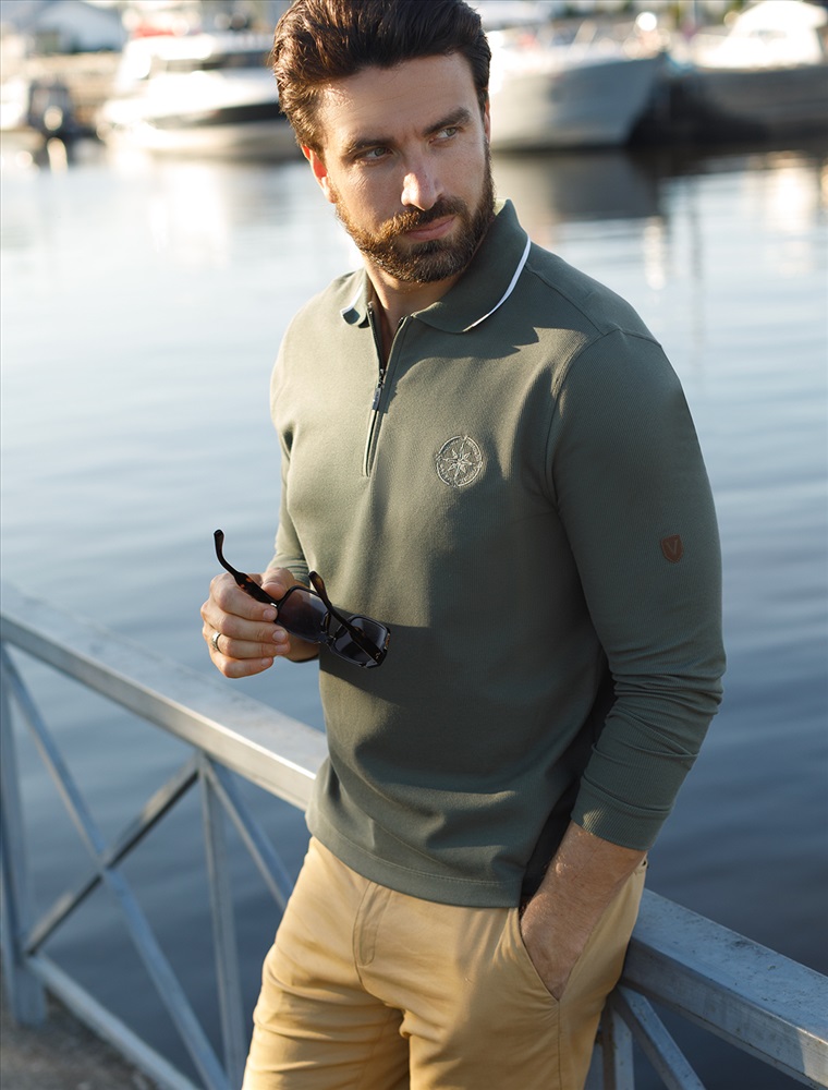 Поло прямого силуэта выполнено из фактурного трикотажа. Плетеный ворот с застежкой планкой на металлической молнии украшен контрастной полоской. Эластичный хлопковый материал хорошо пропускает воздух, а одежда из него не пилингуется и комфортно облегает фигуру. Однотонная модель с длинными рукавами дополнена небольшим вышитым логотипом бренда.