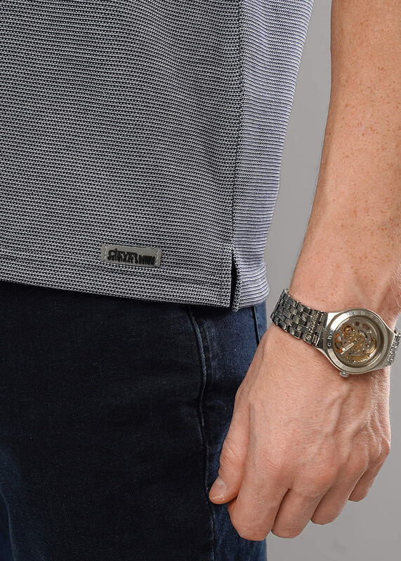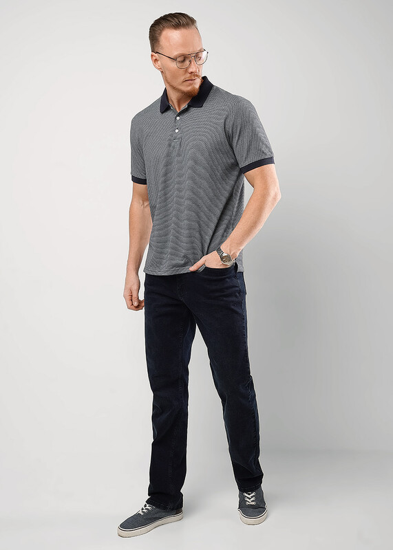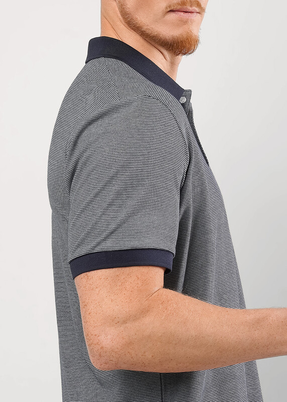 Мужское поло с коротким рукавом, планкой на пуговицах и вязаными отделками. Изделие выполнено из трикотажного фактурного полотна. Дополнена имиджевой фурнитурой. Стильная модель для повседневных и полуформальных образов.