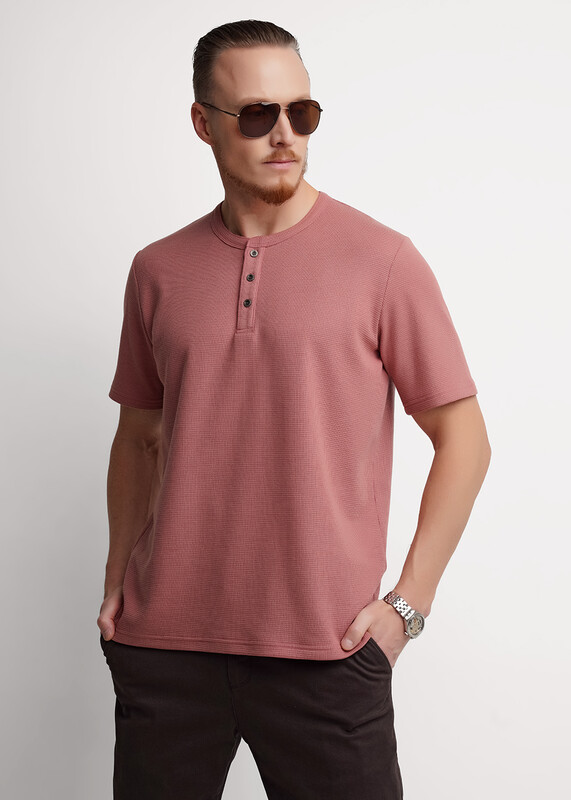 Футболка-поло с воротником-стойка и функциональной планкой на пуговицах, из трикотажного полотна ""вафля"". Изделие дополнено имиджевой фурнитурой и отделочными строчками. Простая и удобная модель, идеально подходящая для повседневного гардероба.