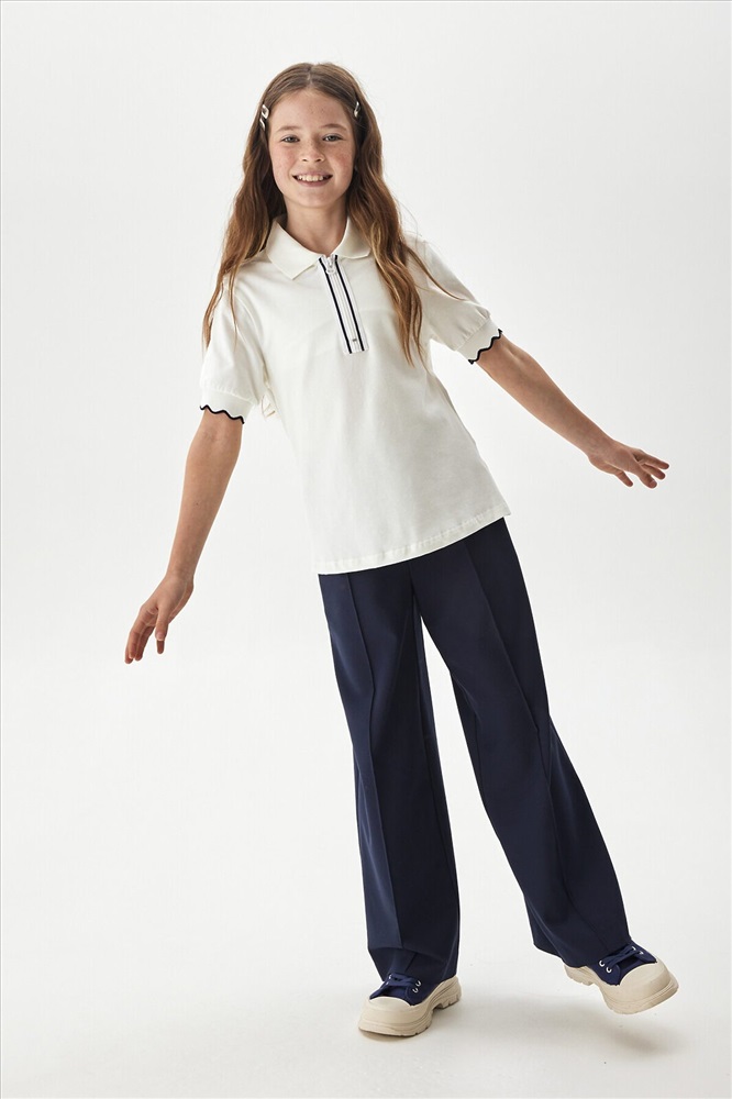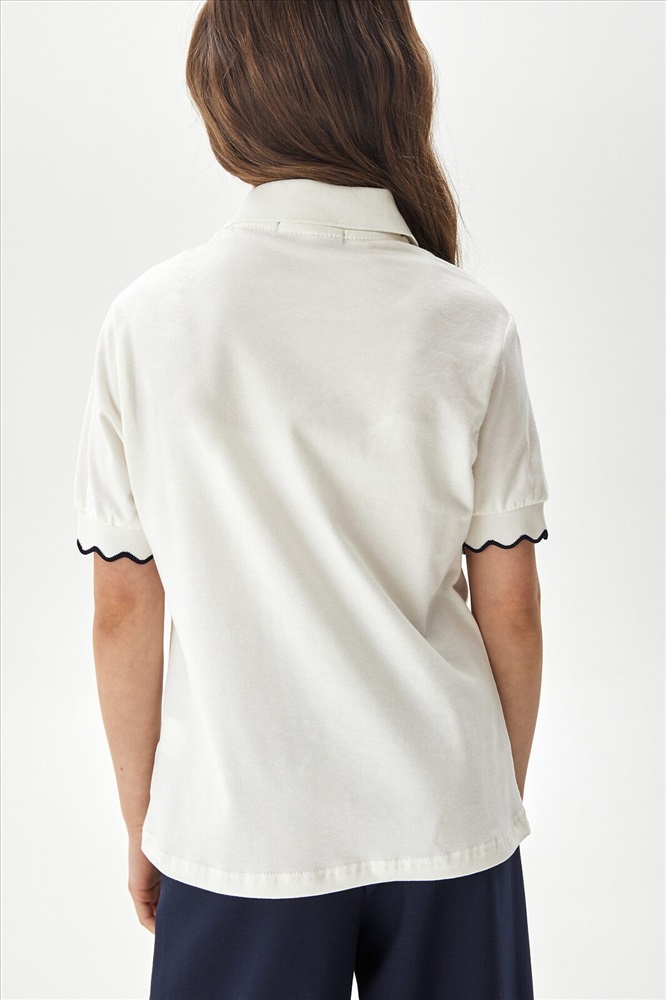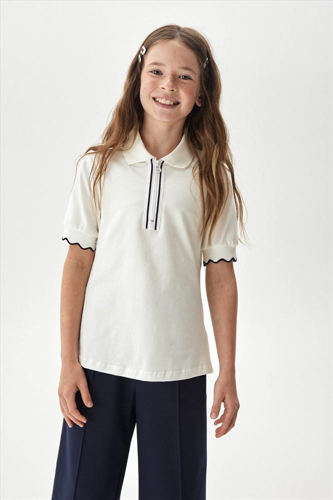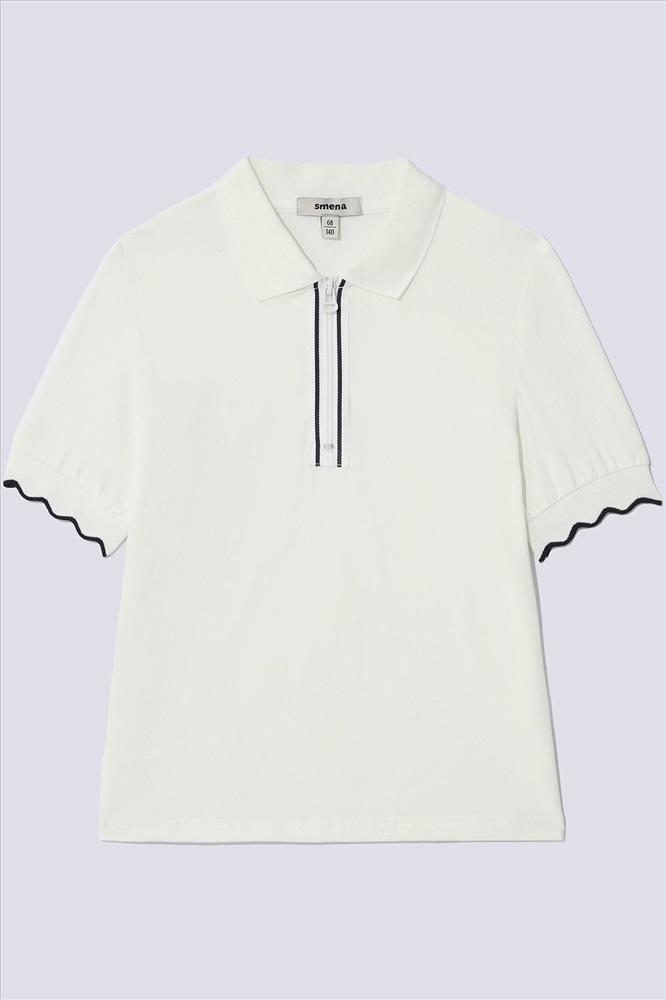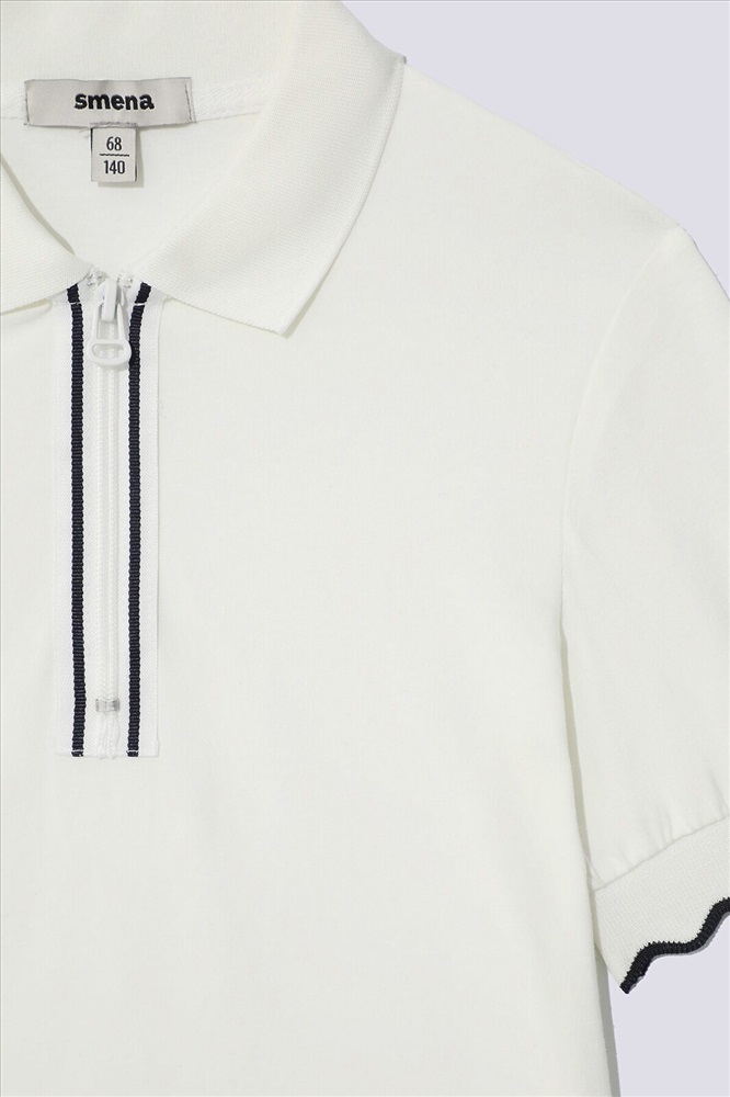 Страна производства: Узбекистан Трикотажное поло для девочки полуприлегающего силуэта с короткими рукавами. Край рукава с манжетами на подвязе и фактурным краем. Воротник отложной со стойкой . Укороченная застёжка на переде на молнию обеспечивает идеальную посадку.
