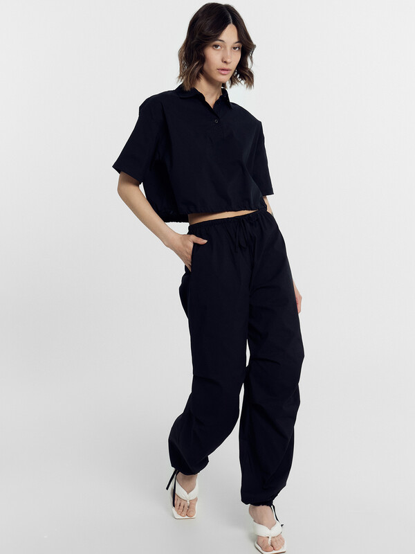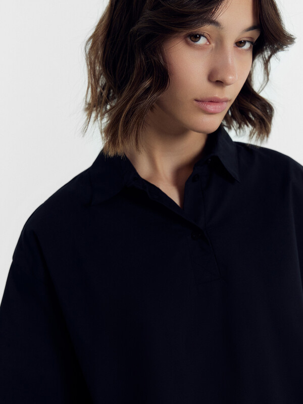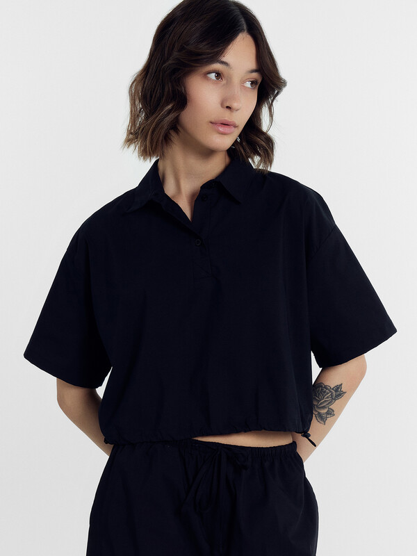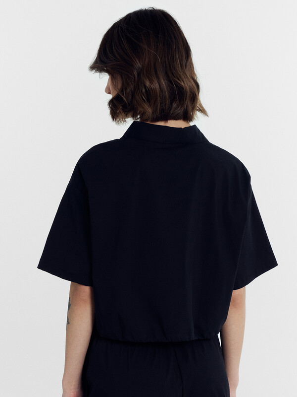 Горловина круглой формы, в горловину втачан стояче-отложной воротник с отрезной стойкой. На детали переда обработана планка на пуговицах. Плечо спущено, пройма углублена. Рукав втачной, короткий. Блузка слегка укорочена, по низу подгибка со шляпной резиной внутри и фиксаторами по боковым швам. 76% хлопок; 22% полиэстер; 2% эластан Комментарии к товару