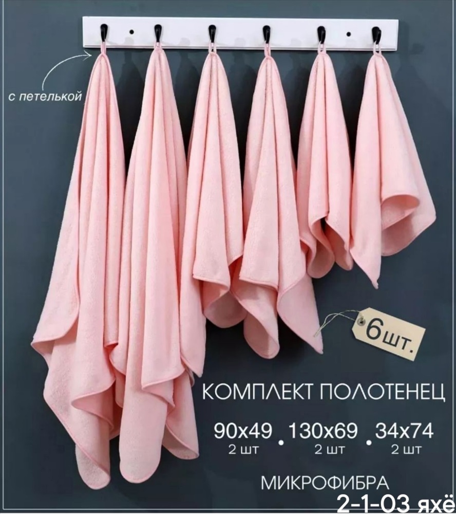 Внимание новинка СУПЕР АКЦИЯ 600₽ Комплект из шести полотенец. УСПЕЙТЕ Цена: 600₽ руб. без выбора Размер: 69*130- 2 шт. 49*90-2 шт. 34*74-2 шт. Очень хорошо впитывает Материал: Микрофибра. Без выбора цвета