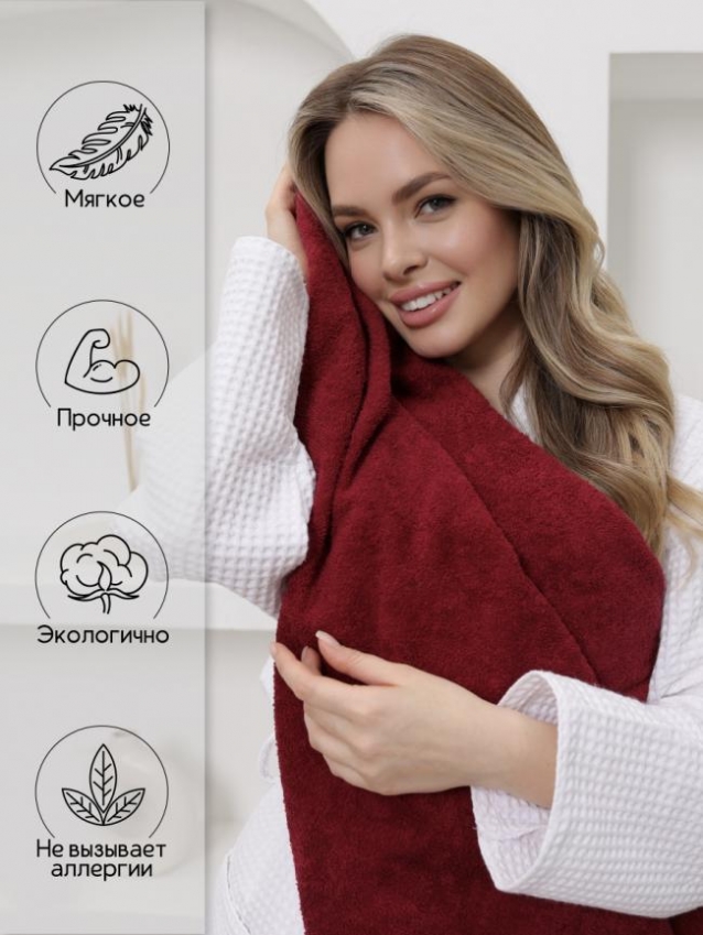 Банное махровое бордовое полотенце размером 70 х 140 см. Оно мягкое, легкое и хорошо впитывает влагу и быстро сохнет. Подходит как для мужчин, так и для детей и женщин. Это отличный подарок, так как полотенце прочное и изготовлено из 100% натурального хлопка. Гипоаллергенное полотенце подходит для ухода за новорожденными после купания. Оно идеально подходит для использования в ванной комнате, душе. Можно использовать его для обертывания тела. Они доступны в красивых цветах на любой вкус. Мужское или женское полотенце подходит для всех, а так же для отелей и гостиниц.