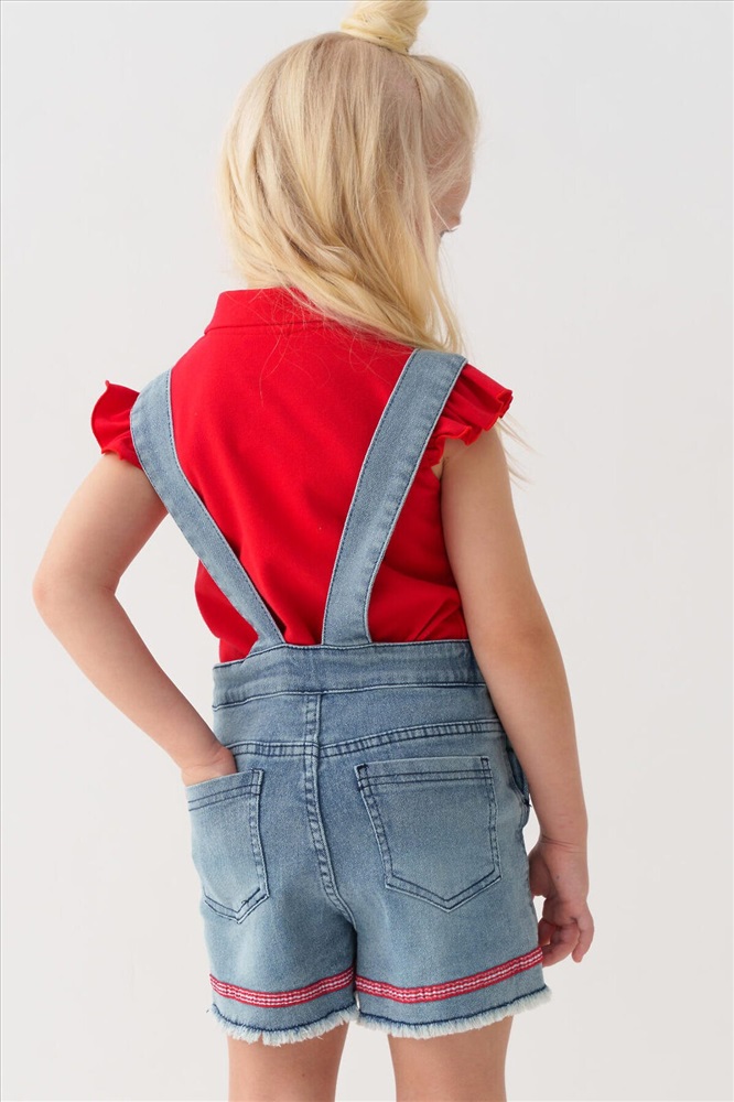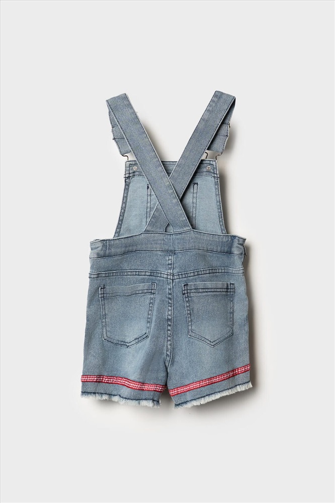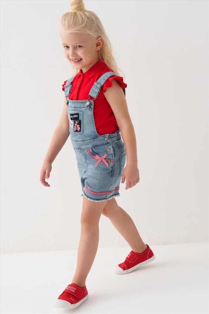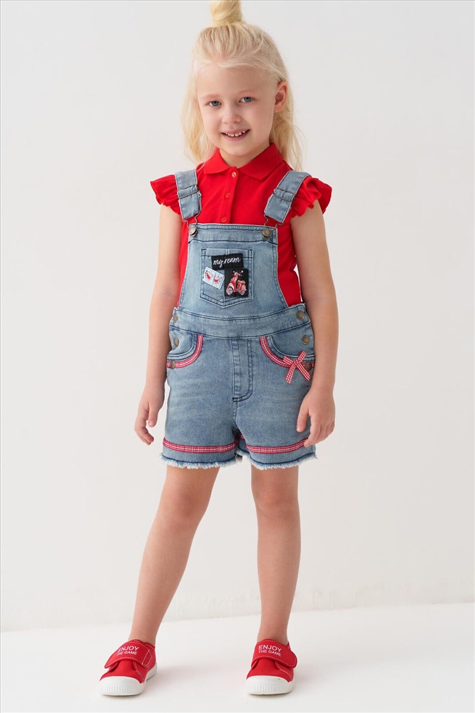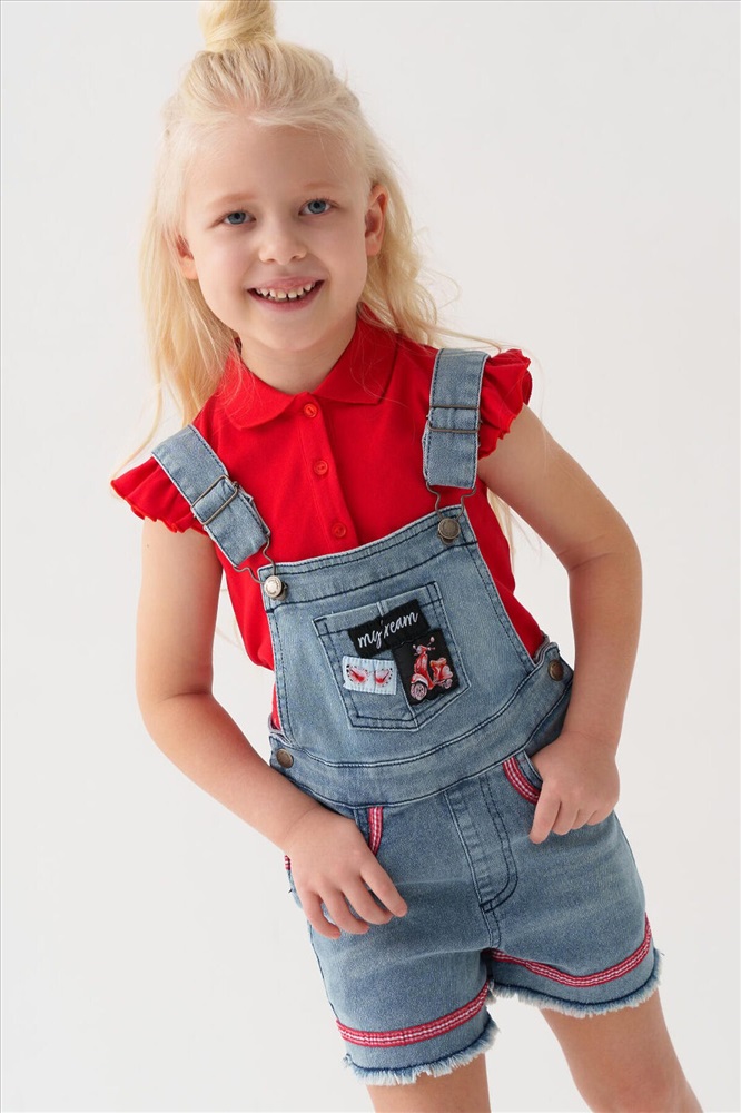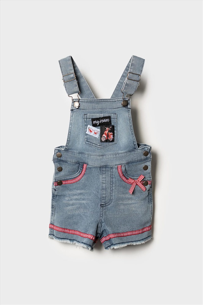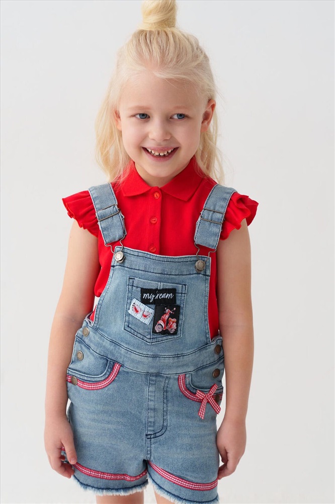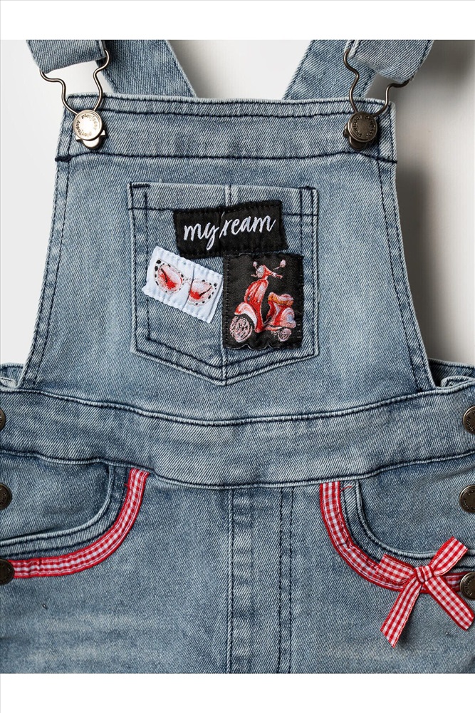 Детский джинсовый полукомбинезон для девочки. Удобная регулировка пояса с внутренней стороны — при помощи резинки и пуговиц. Застегивается на кнопки по бокам. Лямки регулируются по длине за счёт металлических пряжек. Функциональные элементы включают нагрудный, задние накладные карманы и передние карманы. Комбинезон украшен нашивками и декоративным бантиком.