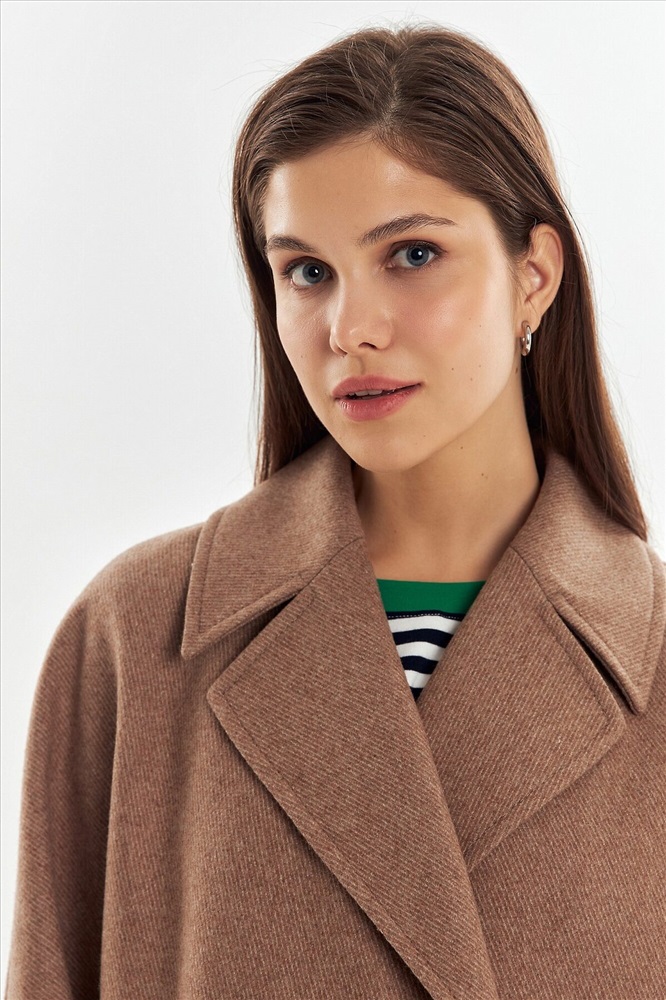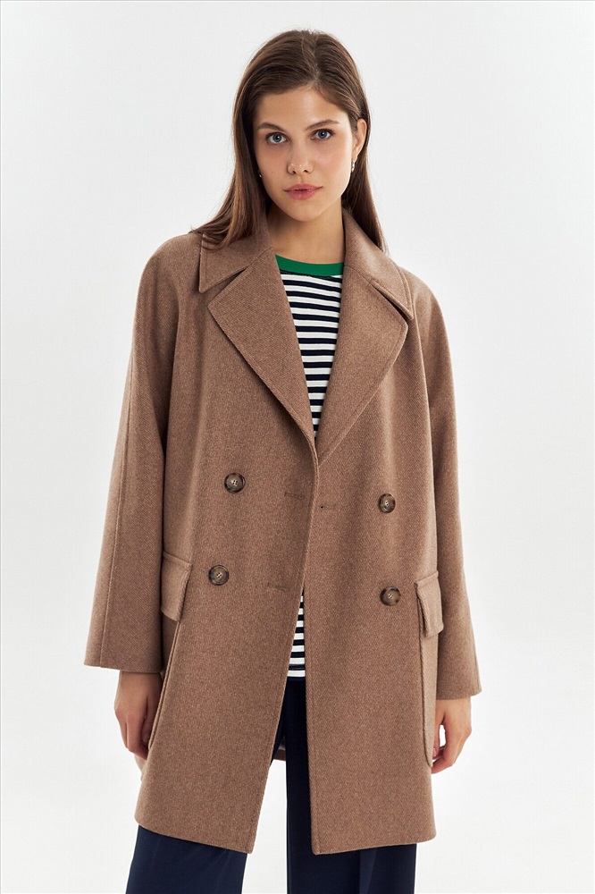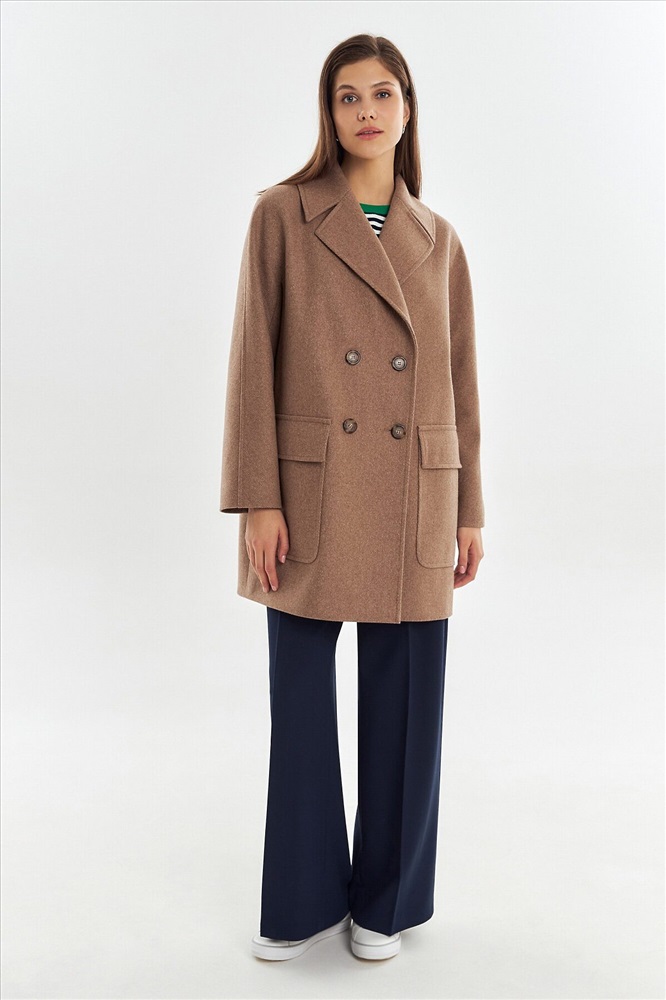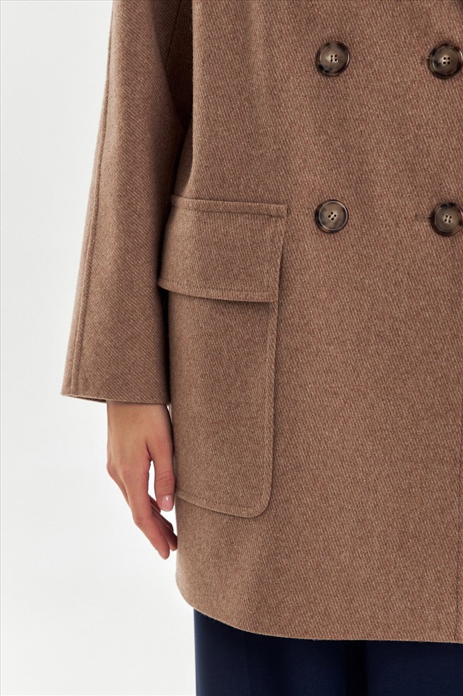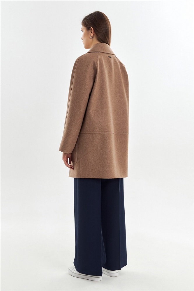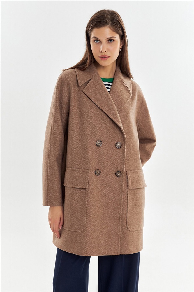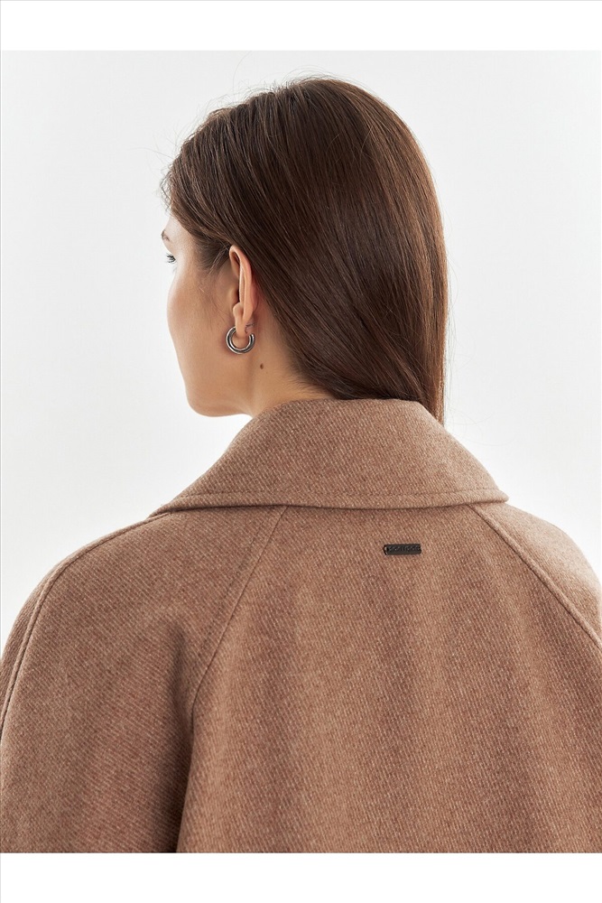 Двубортное укороченное пальто силуэта "кокон" из пальтовой ткани с эффектом "диагональ" в модном карамельном оттенке. Полупальто универсальной длины выше колена, с широким английским воротником и комфортным рукавом уникальной комбинированной конструкции: цельнокроеный спереди и реглан на спинке. Функциональным декоративным элементом служат большие накладные карманы с клапанами. Остроты пальто добавляют широкие отделочные строчки. Застежка на два ряда стильных пуговиц под натуральный рог. Для дополнительной защиты от непогоды изделие выполнено с использованием высокотехнологичной мембраны RaftPro. Произведено в Санкт-Петербурге.