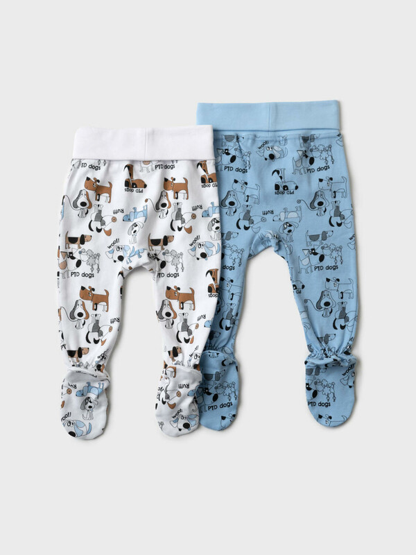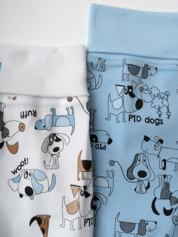 Комплект из двух мягких ползунков для новорожденного мальчика. Обе модели с закрытыми ножками и удобным широким поясом на резинке. Один из вариантов украшен ярким принтом с весёлыми собачками на белом фоне, второй — выполнен в голубом цвете с тем же принтом. На поясе спереди есть декоративная нашивка с логотипом. Материал — приятный к телу, 100 % хлопковой трикотаж интерлок.