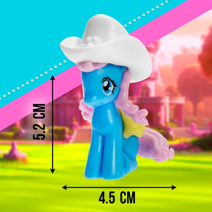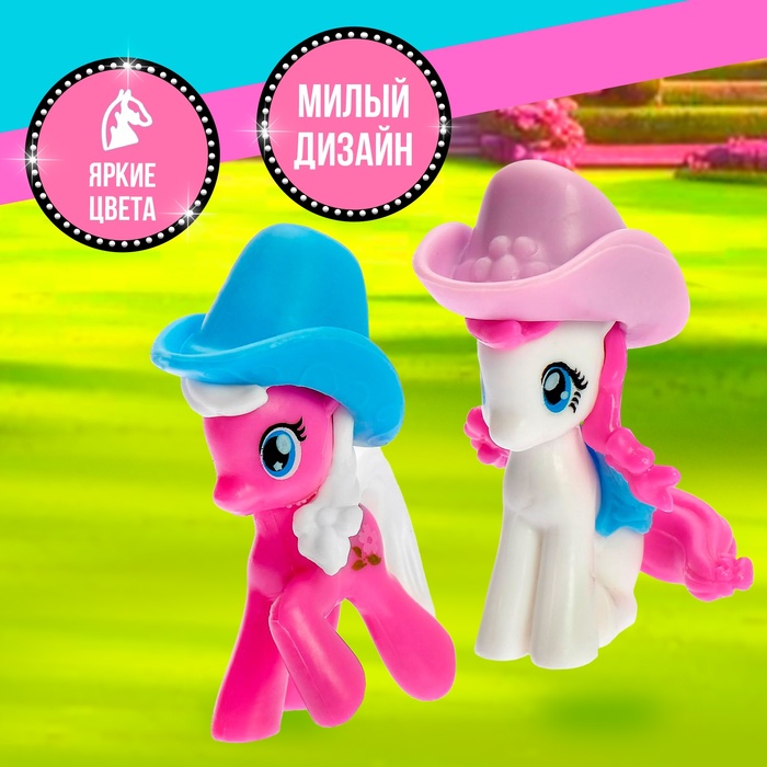 Страна: Китай В боксе: 1440 шт Состав: Пластик Материалы: пластик Фасовка: по 24 шт Индивидуальная упаковка: Картонная коробка с PVC Габариты товара: 4,5 см × 2 см × 5,2 см Сертификат: ЕАС Цвет: МИКС Для кого: Для девочки Высота, см: 5,2 Возраст: От 3 лет Вид упаковки: Коробка картонная с PVC Символ года: Символ года 2026 (Лошадь) Тематика праздника: Новый год Материал: Пластик Звук: Нет Свет: Нет Особенности куклы: Без особенностей Вид: Пони Эти яркие и милые пони в шляпах станут прекрасным дополнением к коллекции игрушек вашего ребёнка. Каждая фигурка изготовлена из универсального пластика и отличается высоким качеством исполнения. Особенности