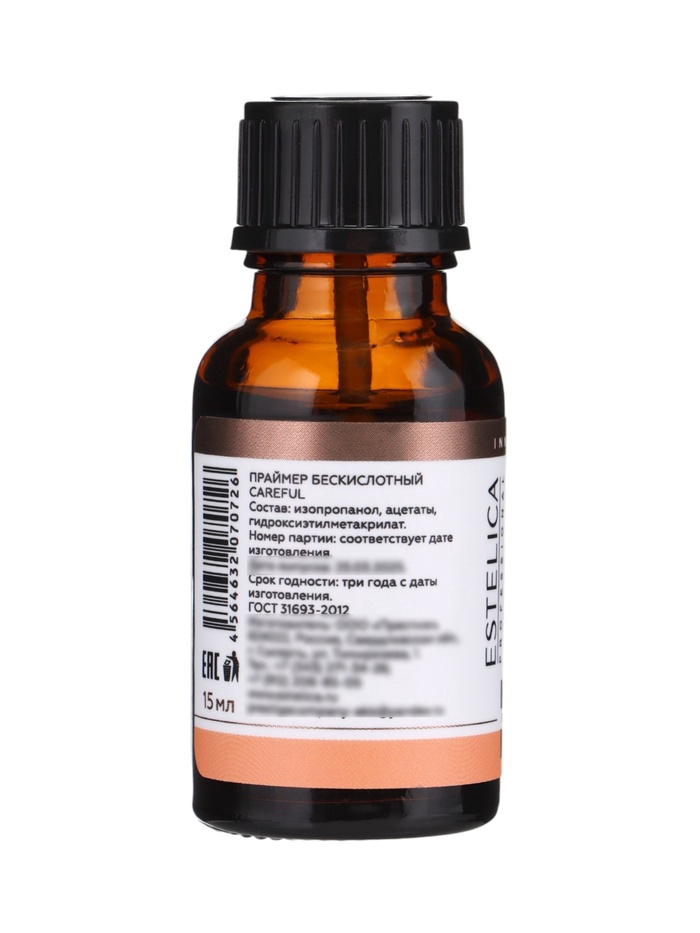 ESTELICA PROFESSIONAL CAREFUL, бескислотный праймер 15 мл — профессиональное средство для усиления адгезии и надёжного соединения ногтевой пластины с искусственными материалами, такими как гель-лак, гель или акрил. Праймер создаёт тонкую защитную пленку на поверхности ногтя, которая обеспечивает прочное сцепление и предотвращает образование сколов и отслоений.