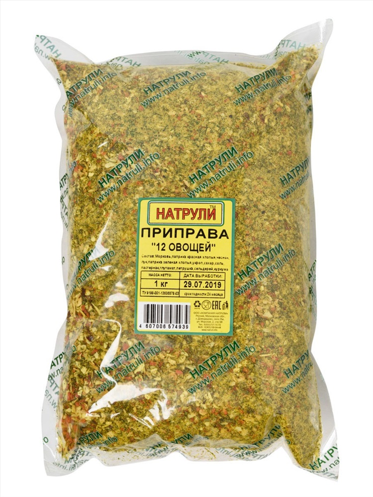 морковь, куркума, паприка красная, зеленая, чеснок, лук, пастернак, укроп, петрушка, сельдерей, базилик, соль, сахар, глутамат.