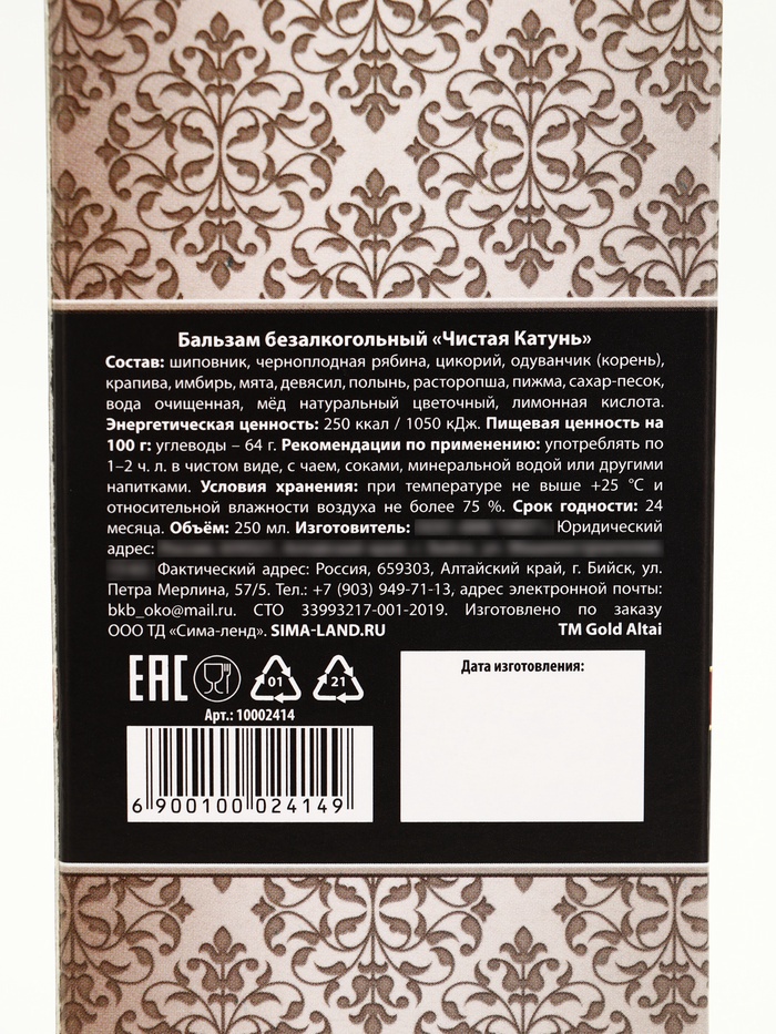 Габариты: 4 x 6,7 x 18 Страна: Россия В боксе: 36 шт Фасовка: по 1 шт Индивидуальная упаковка: Термоусадочная пленка Сертификат: ЕАС Набор: Да Срок годности, мес: 24 Объём, мл: 250 Тематика праздника: Универсальная тематика Адресат: Без адресата Вкус: Травы Темпер. ограничение НЕ НИЖЕ ℃: 0 Возраст: Для взрослых Назначение: Для иммунной системы ПРИ ОФОРМЛЕНИИ ЗАКАЗА, ПРОСИМ ЗАПРАШИВАТЬ АКТУАЛЬНЫЕ СРОКИ ГОДНОСТИ У МЕНЕДЖЕРА Состав: шиповник, черноплодная рябина, цикорий, корень одуванчика, крапива, имбирь, мята, девясил, полынь, расторопша, пижма, сахар, очищенная вода, натуральный цветочный мёд, лимонная кислота. Способ применения: 1-2 ч. Л. Добавлять в чай, кофе, молоко, сок и другие жидкости в течение дня. Срок годности: 24 месяца Масса нетто: 250 мл. Комментарии к товару