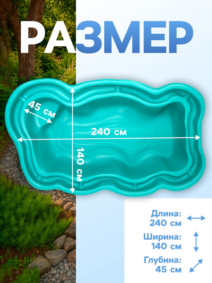 Доставка: Платная Страна: Россия В боксе: 2 шт Состав: Пластик Материалы: пластик Фасовка: по 1 шт Индивидуальная упаковка: Без упаковки Сертификат: Не подлежит сертификации Цвет: Зелёный Длина, см: 240 Ширина, см: 140 Глубина, см: 45 Объём, л: 1300 Устройте на даче искусственный водоём. Для этого отлично подойдёт пластиковый пруд. Он подчеркнёт красоту участка, создаст особую атмосферу и расположит вас к расслаблению и созерцанию. Преимущества пруда из пластика:
