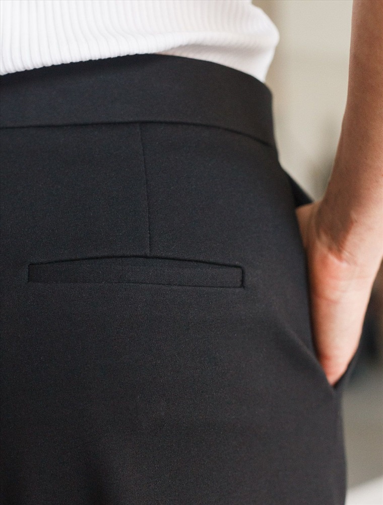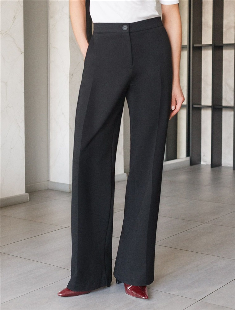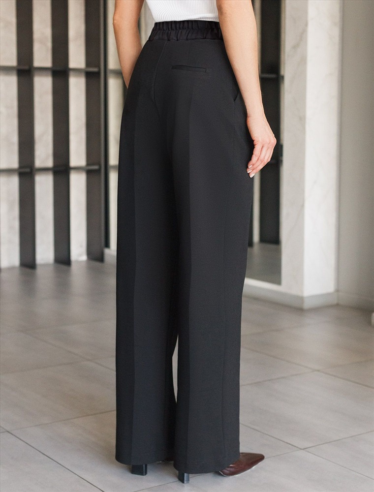 Прямые брюки выполнены из трикотажа джерси. Модель дополнена боковыми карманами и поясом на резинке сзади. Заутюженные стрелки визуально вытягивают силуэт. Изделие хорошо держит форму, отлично тянется и почти не мнется во время использования. Идеальный вариант в офис или в повседневный классический стиль.