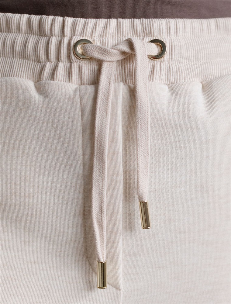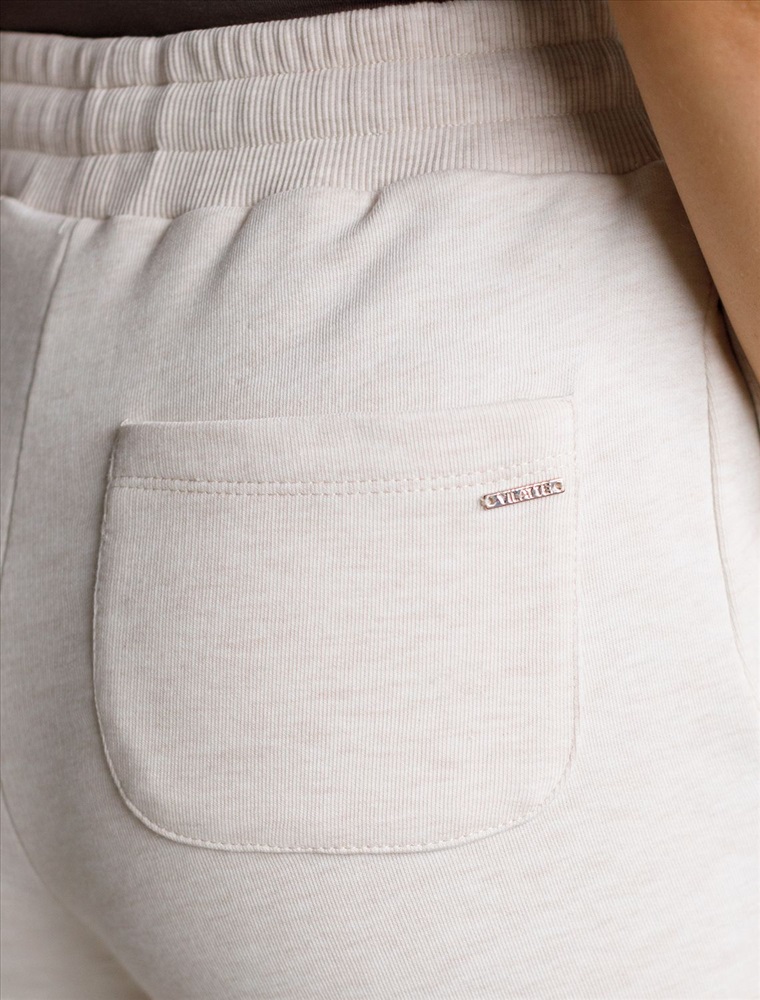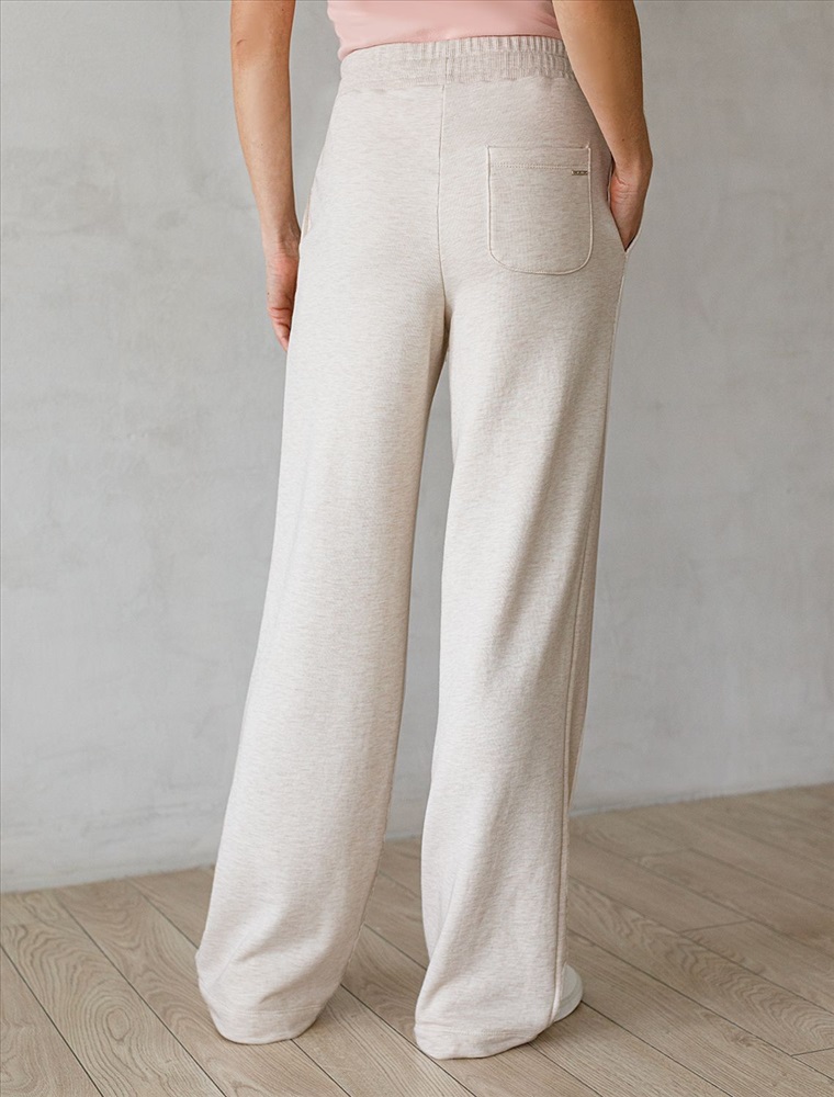 Брюки выполнены из премиального футера трехнитки без начеса. Модель дополнена эластичным поясом на резинке и хлопковым шнурком с золотистой фурнитурой. По бокам два кармана. Наличие эластана в составе гарантирует формоустойчивость и износостойкость изделия. Изделие сочетается в костюме с худи D49.052