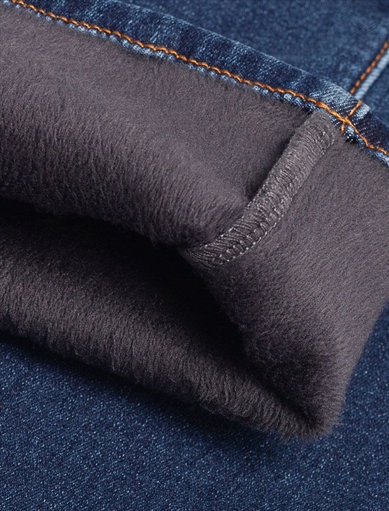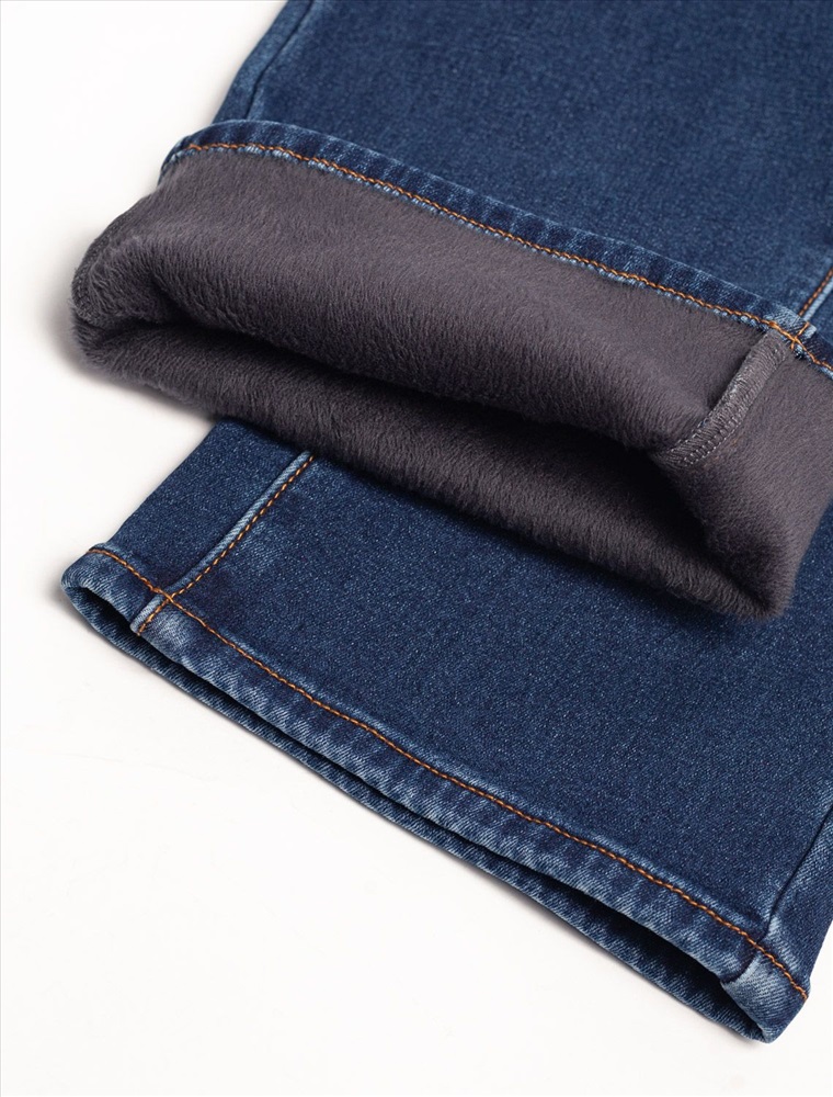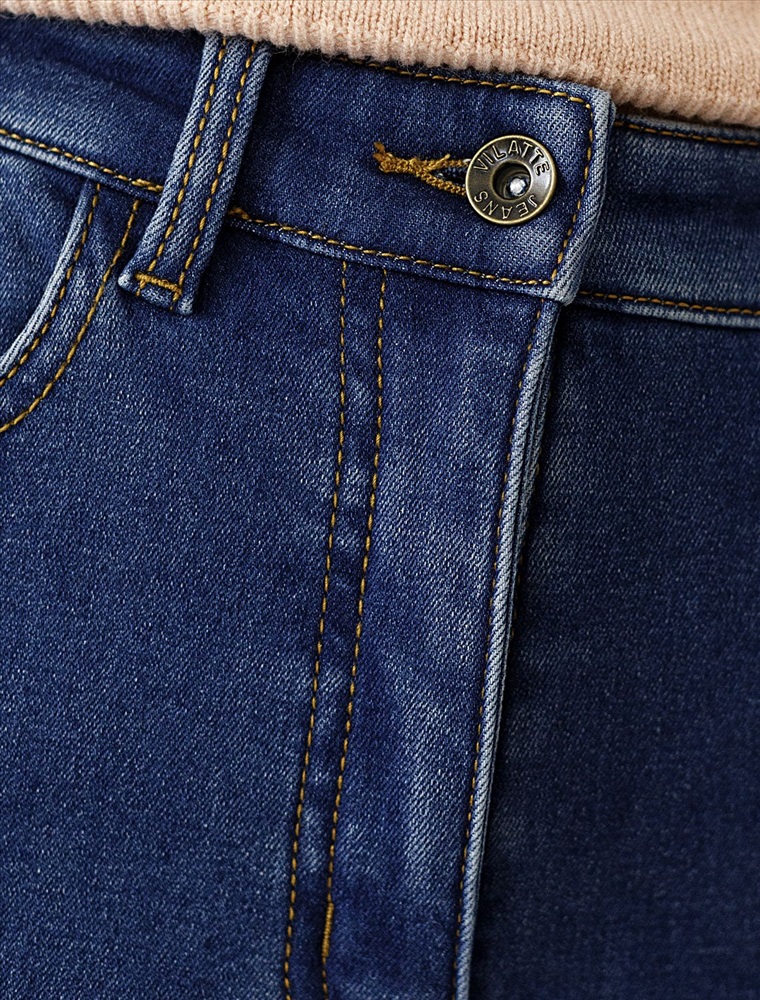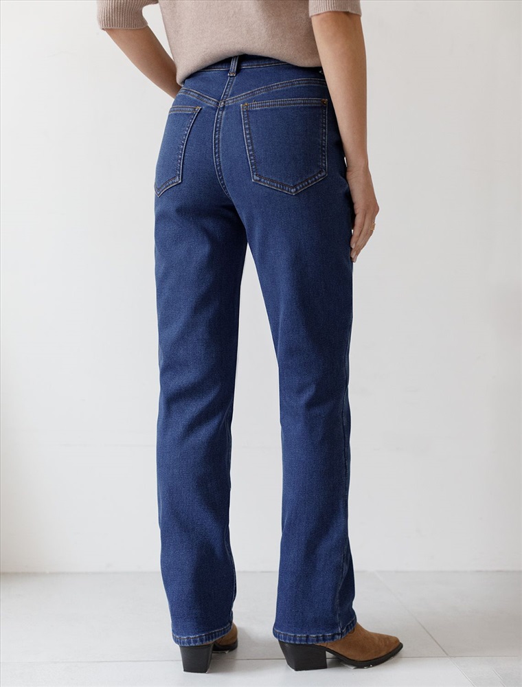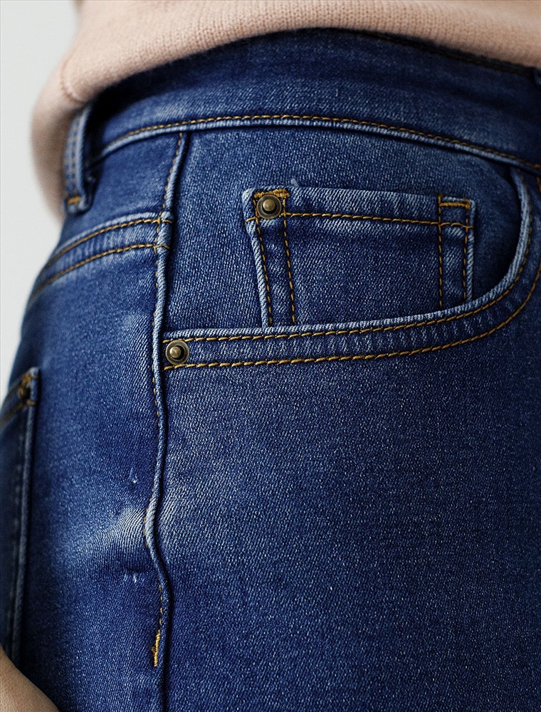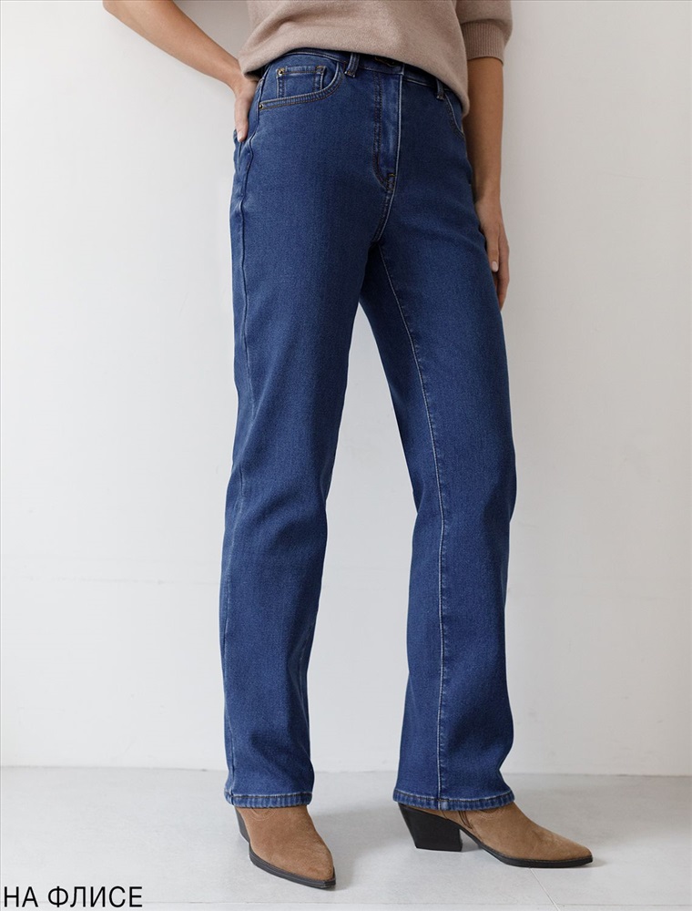 Прямые джинсы выполнены из эластичного денима плотностью 16,6 oz. Удлиненная модель синего цвета с контрастными строчками. Комфортная посадка на талии подходит для любой фигуры, ткань хорошо тянется и не сковывает движений. На поясе сзади расположен нашивка из эко-кожи с логотипом бренда. Длина изделия позволяет выбрать к образу обувь на каблуке