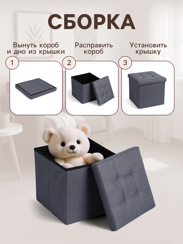 Габариты: 37,5 x 37,5 x 5 Доставка: Платная Страна: Китай В боксе: 10 шт Состав: МДФ, пенополиуретан, мебельная ткань Материалы: МДФ, пенополиуретан, мебельная ткань Фасовка: по 1 шт Индивидуальная упаковка: Плёнка Габариты товара: 38 см × 38 см × 5 см Сертификат: ЕАС Цвет: Серый Для кого: Для женщины, Унисекс, Для мальчика, Для девочки, Для мужчины Ширина, мм: 380 Высота, мм: 380 Глубина, мм: 380 Материал корпуса: МДФ Оттенок: Серый Возраст: Взрослый, Подростковый, Детский, Любой Материал: Рогожка, Пенополиуретан, МДФ Ящик для хранения: Да Материал обивки: Рогожка Вид: Пуф Стиль: Минимализм На высоких ножках: Нет Складной пуф – короб Практичный и компактный элемент мебели для небольших помещений. Сочетает в себе удобное мягкое сиденье, вместительный ящик для хранения и лаконичный внешний вид. Строгая геометрия и аккуратная декоративная прострочка на крышке делают пуф выразительным акцентом в интерьере. Прочный корпус из МДФ позволяет выдерживать пуфу нагрузку до 120 кг, оставаясь устойчивым. Преимущества и особенности ![]() Многофункциональность Внутри можно хранить всё, что нужно спрятать, но держать под рукой: игрушки, пледы, сезонные вещи, книги или обувь. Может использоваться как подставка под ноги или мини – столик. ![]() Складной корпус: экономия места при хранении Складывается до компактных размеров и убирается в шкаф, под кровать или на антресоль. Решение для сезонного хранения или для временного использования ![]() Конструкция из МДФ: выдерживает до 120 кг Можно использовать не только как временное сиденье, но и как полноценную табуретку — для взрослых и детей. ![]() Мягкое сиденье с с декоративной прострочкой Сидеть комфортно за счёт мягкого наполнителя, квадратная стёжка на крышке делает внешний вид более стильным и законченным. Состав
