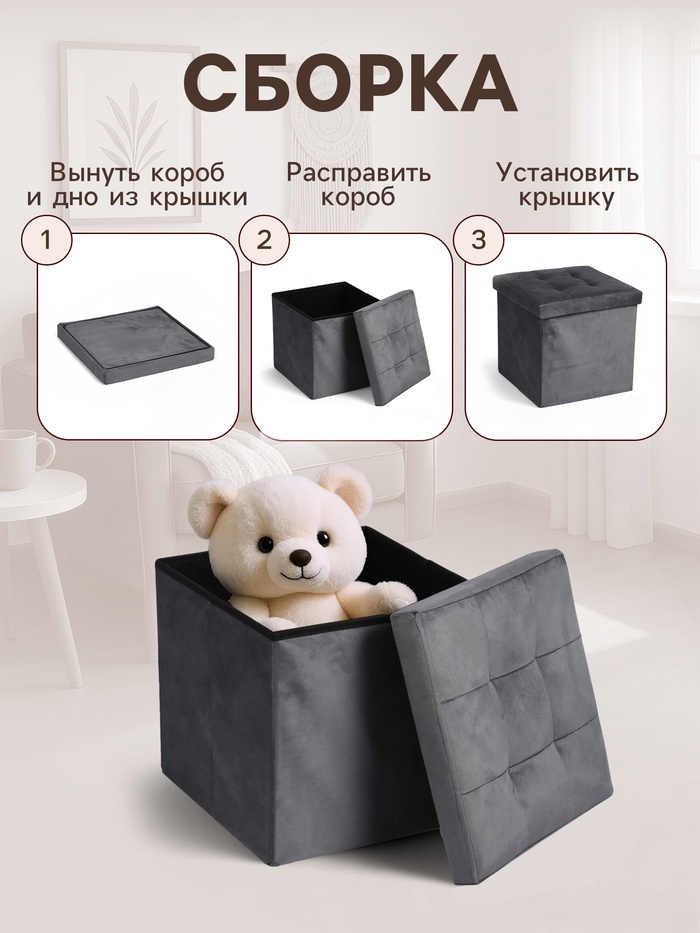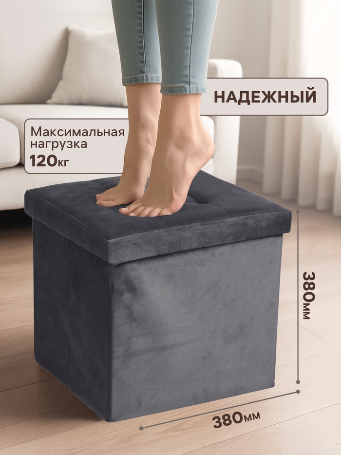 Габариты: 37,5 x 37,5 x 5 Доставка: Платная Страна: Китай В боксе: 10 шт Состав: МДФ, пенополиуретан, мебельная ткань Материалы: МДФ, пенополиуретан, мебельная ткань Фасовка: по 1 шт Габариты товара: 38 см × 38 см × 5 см Сертификат: ЕАС Цвет: Серый Для кого: Унисекс, Для девочки, Для мальчика, Для женщины, Для мужчины Ширина, мм: 380 Высота, мм: 380 Глубина, мм: 380 Материал корпуса: МДФ Оттенок: Серый Возраст: Детский, Подростковый, Любой, Взрослый Материал: Велюр, МДФ, Пенополиуретан Ящик для хранения: Да Материал обивки: Велюр Вид: Пуф Стиль: Минимализм На высоких ножках: Нет Складной пуф – короб Практичный и компактный элемент мебели для небольших помещений. Сочетает в себе удобное мягкое сиденье, вместительный ящик для хранения и лаконичный внешний вид. Строгая геометрия и аккуратная декоративная прострочка на крышке делают пуф выразительным акцентом в интерьере. Прочный корпус из МДФ позволяет выдерживать пуфу нагрузку до 120 кг, оставаясь устойчивым. Преимущества и особенности ![]() Многофункциональность Внутри можно хранить всё, что нужно спрятать, но держать под рукой: игрушки, пледы, сезонные вещи, книги или обувь. Может использоваться как подставка под ноги или мини – столик. ![]() Складной корпус: экономия места при хранении Складывается до компактных размеров и убирается в шкаф, под кровать или на антресоль. Решение для сезонного хранения или для временного использования ![]() Конструкция из МДФ: выдерживает до 120 кг Можно использовать не только как временное сиденье, но и как полноценную табуретку — для взрослых и детей. ![]() Мягкое сиденье с с декоративной прострочкой Сидеть комфортно за счёт мягкого наполнителя, квадратная стёжка на крышке делает внешний вид более стильным и законченным. Состав