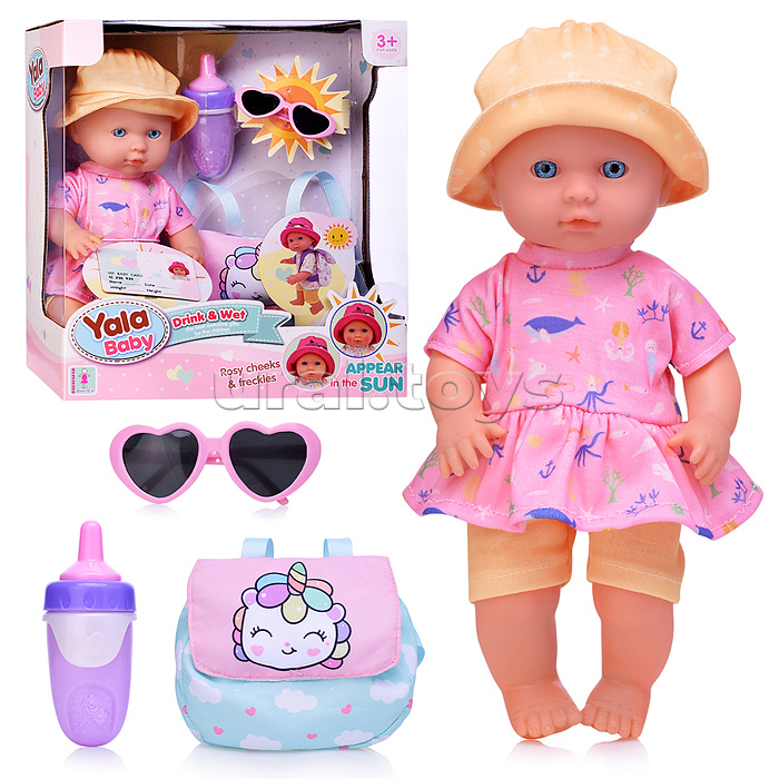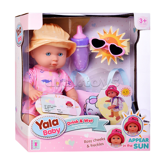 • Высота пупса: 30 см. • Подвижные руки и ноги. • Глаза вставные. • Функции: - пьёт из бутылочки. - ходит на горшок. - на солнышке появляются веснушки. • Материал пупса: полимерные материалы, текстиль. • В комплекте: бутылочка, сумочка, очки. • Соответствует требованиям безопасности продукции. • Для детей с 3-х лет.