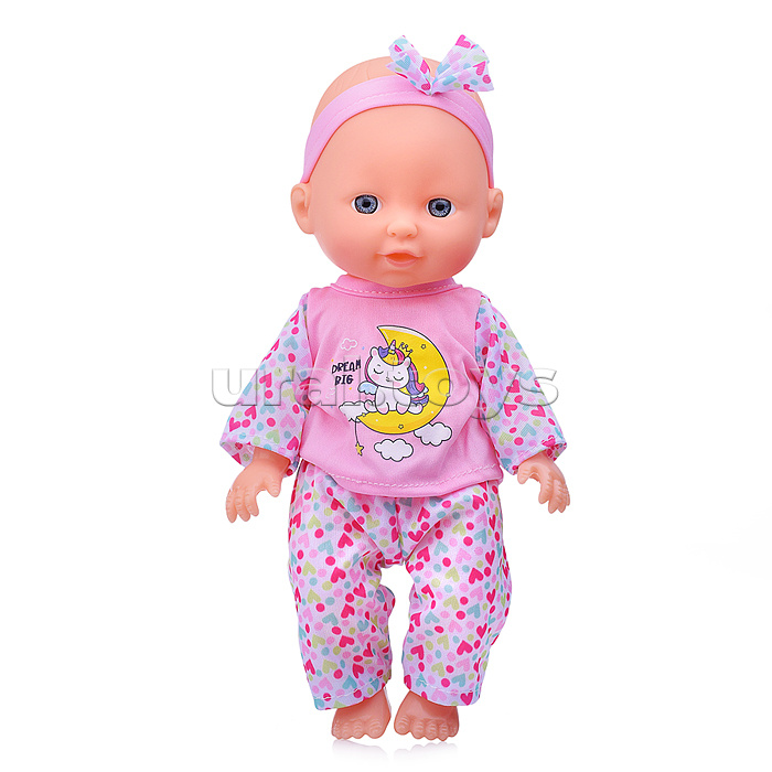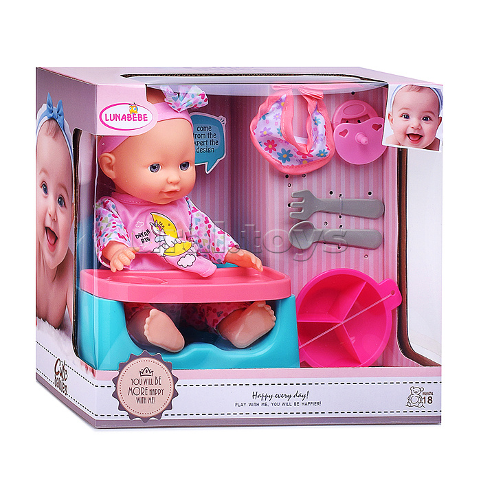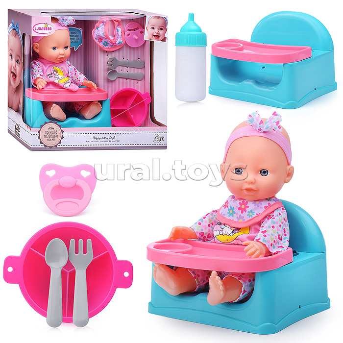 Код: 490108 Штрихкод: 6904111909129 Страна производитель: Китай Размеры упаковки: 30 x 17 x 27 см Количество в коробке: 18 • Высота пупса: 27 см. • Подвижные руки и ноги. • Вставные глаза. • Материал пупса: полимерные материалы, текстиль. • В комплекте: соска, бутылочка, тарелка, ложка, стол для кормления (17х10,5х12 см.). • Соответствует требованиям безопасности продукции. • Для детей с 18 месяцев. Комментарии к товару