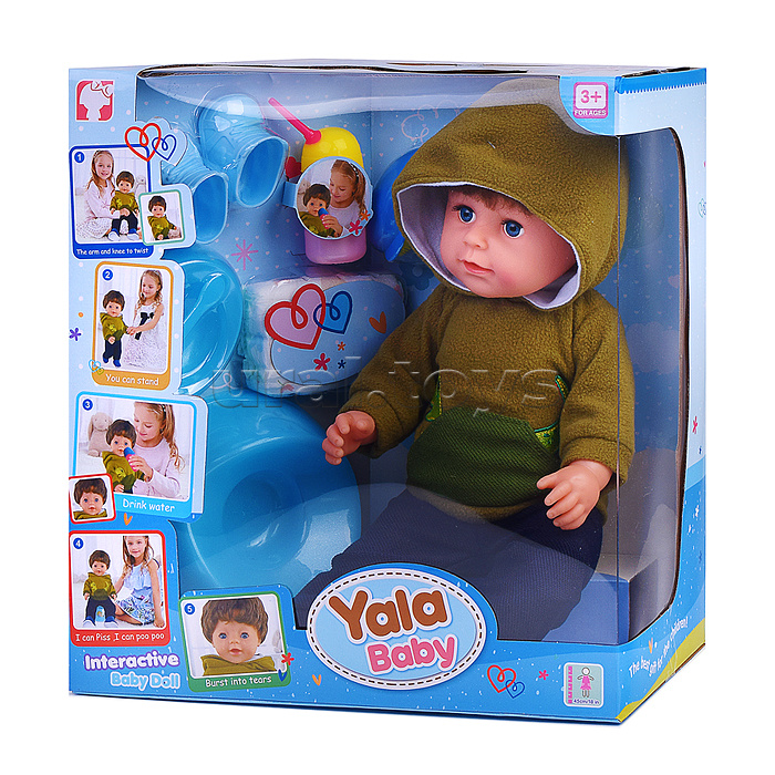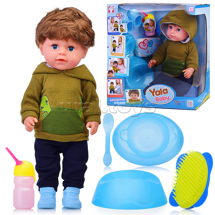 • Высота куклы: 45 см. • Подвижные руки и ноги. • Функции: - пьёт из бутылочки. - ходит на горшок. • Тело и ноги из пластика. руки и голова из ПВХ. • В комплекте: бутылочка, горшок, тарелочка с ложечкой, расческа. • Соответствует требованиям безопасности продукции. • Для детей с 3-х лет.