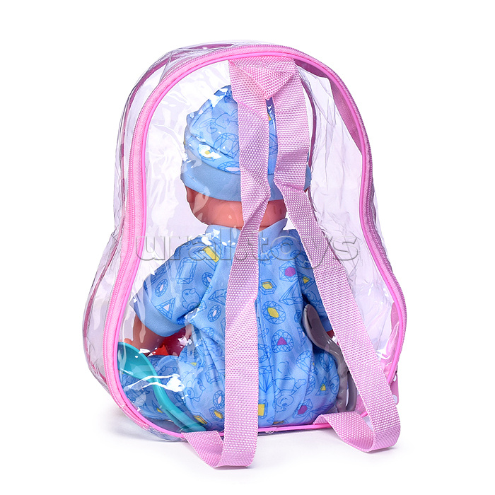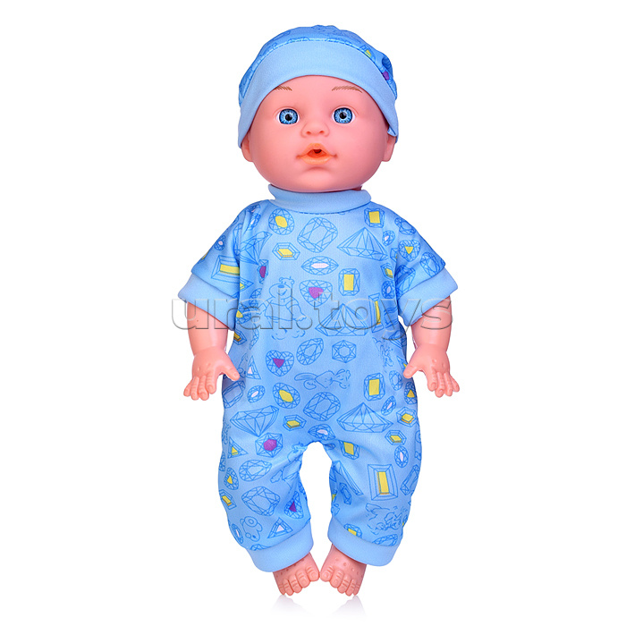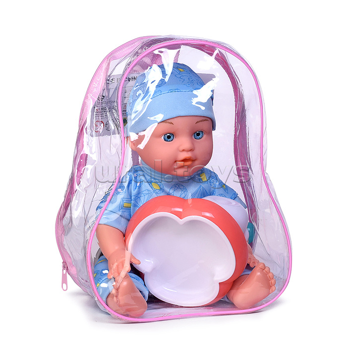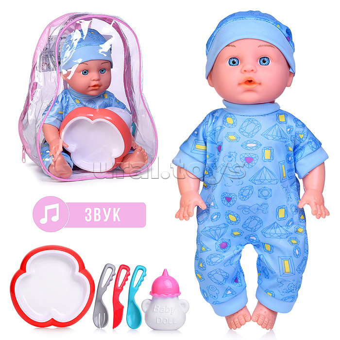 Высота куклы: 29 см. Можно поить из бутылочки и садить на горшок. Воспроизводит детские звуки (мама, папа, смеётся, плачет) при нажатии на звуковой модуль, расположенный в животе. Для работы звукового модуля используются 3 батарейки типа AG13 (в комплекте демонстрационные). В комплекте: бутылочка, тарелочка, 3 столовых прибора. Материал: пластик. Соответствует требованиям безопасности продукции. Для детей от 3-х лет.
