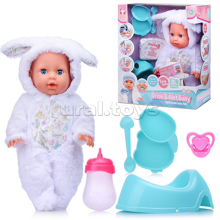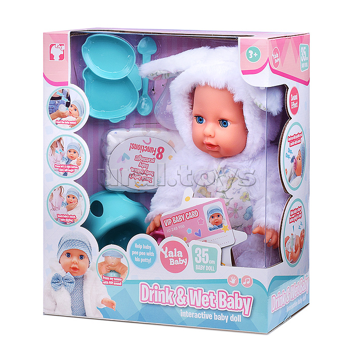 Код: 486422 Штрихкод: 6904111559713 Страна производитель: Китай Размеры упаковки: 29 x 34 x 15 см Количество в коробке: 12 • Высота пупса: 35 см. • Подвижные руки и ноги. • Глаза вставные, закрывающиеся. • Кукла озвучена. • Функции: - пьёт из бутылочки. - ходит на горшок. - издает различные звуки (плачь, кашель, баба/мама.), • Работает от 3-х батареек "АА" ( в комплект не входят). • Материал пупса: полимерные материалы, текстиль. • В комплекте: бутылочка, соска, горшок, тарелочка, ложка. • Соответствует требованиям безопасности продукции. • Для детей с 3-х лет. Комментарии к товару