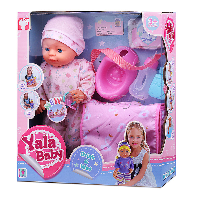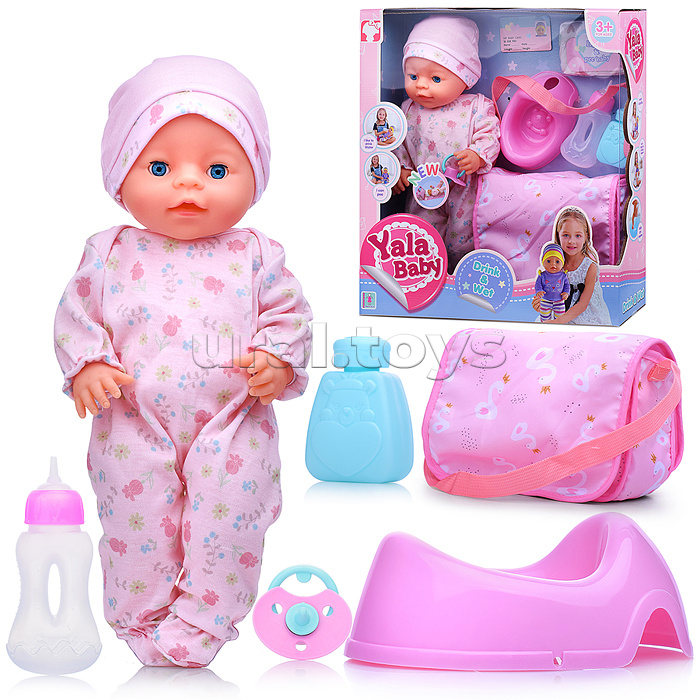 Код: 486404 Штрихкод: 6904110355613 Страна производитель: Китай Размеры упаковки: 37 x 13 x 40 см Количество в коробке: 12 • Высота пупса: 40 см. • Подвижные руки и ноги. • Глаза вставные, закрывающиеся. • Функции: - пьёт из бутылочки. - ходит на горшок. • Материал пупса: полимерные материалы, текстиль. • В комплекте: бутылочка, соска, горшок, сумочка. • Соответствует требованиям безопасности продукции. • Для детей с 3-х лет. Комментарии к товару