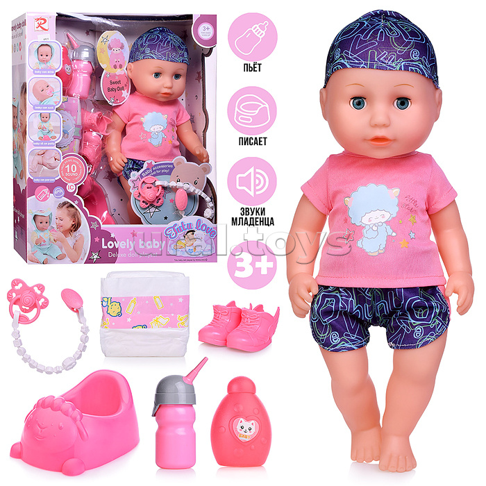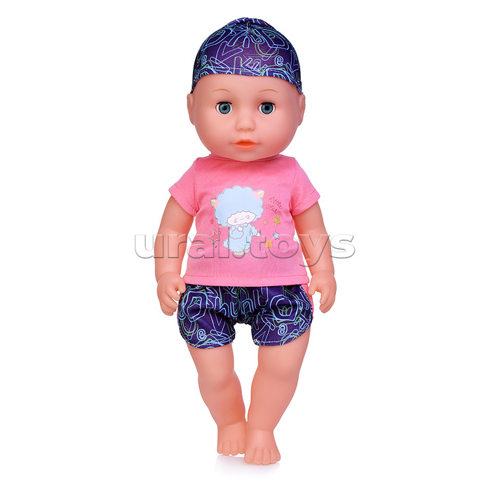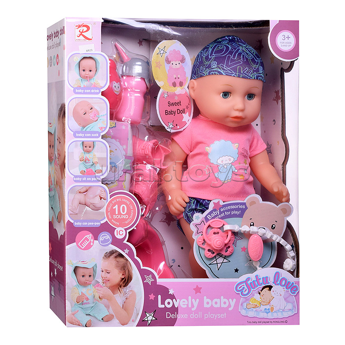 • Рост пупса: 35 см. • Тело из пластика, руки ноги и голова из ПВХ. • Ручки и ножки подвижные, анатомически согнуты в суставах. • Глаза вставные закрывающиеся. • Можно поить из бутылочки. • В комплекте: бутылка, пустышка, памперс, горшок. • При нажатии на звуковой модуль воспроизводит детские звуки. • Для работы звукового модуля используются 3 батарейки типа AG13 (в комплекте демонстрационные). • Материалы: пластик, ПВХ, текстиль. • Соответствует требованиям безопасности продукции. • Для детей от 3-х лет.
