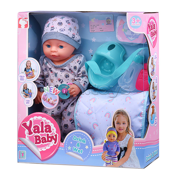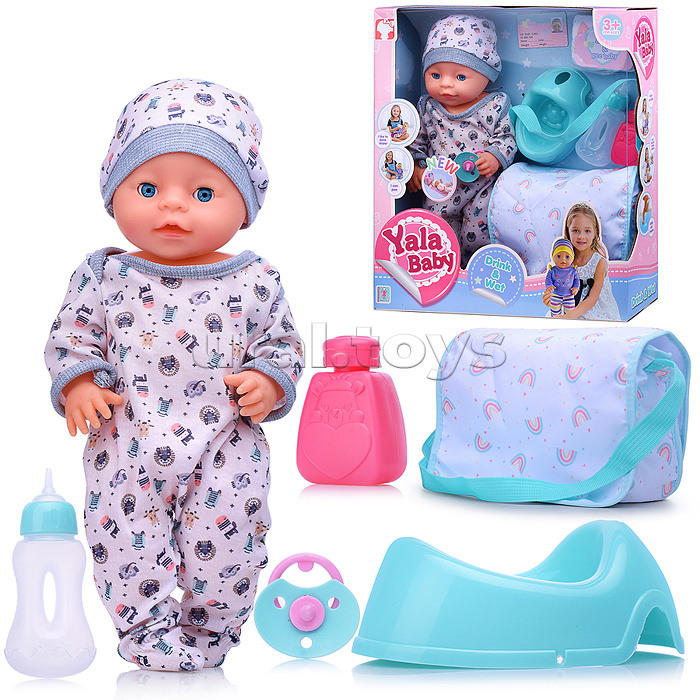 Код: 486405 Штрихкод: 6904110355644 Страна производитель: Китай Размеры упаковки: 37 x 13 x 40 см Количество в коробке: 12 • Высота пупса: 40 см. • Подвижные руки и ноги. • Глаза вставные, закрывающиеся. • Функции: - пьёт из бутылочки. - ходит на горшок. • Материал пупса: полимерные материалы, текстиль. • В комплекте: бутылочка, соска, горшок, сумочка. • Соответствует требованиям безопасности продукции. • Для детей с 3-х лет. Комментарии к товару